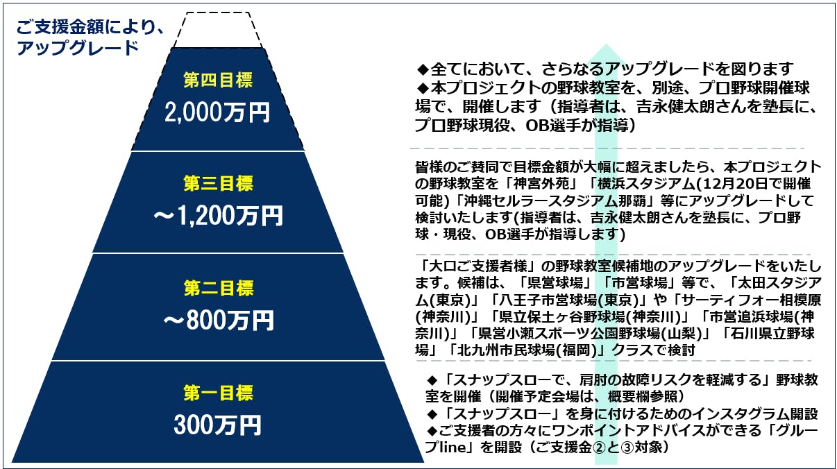 なお、野球教室の会場は、本クラウドファンディングでの最終支援金額が予定金額より高まった場合、「市民球場・県営球場クラス」から「プロ野球選公式戦」開催球場クラスへとアップしていきます。