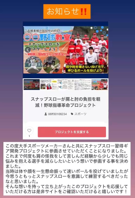 「グループline」(1line最大500人×人数分)を開設。ご支援者様は「小・中学生の投球動画」を1回、アップできます。