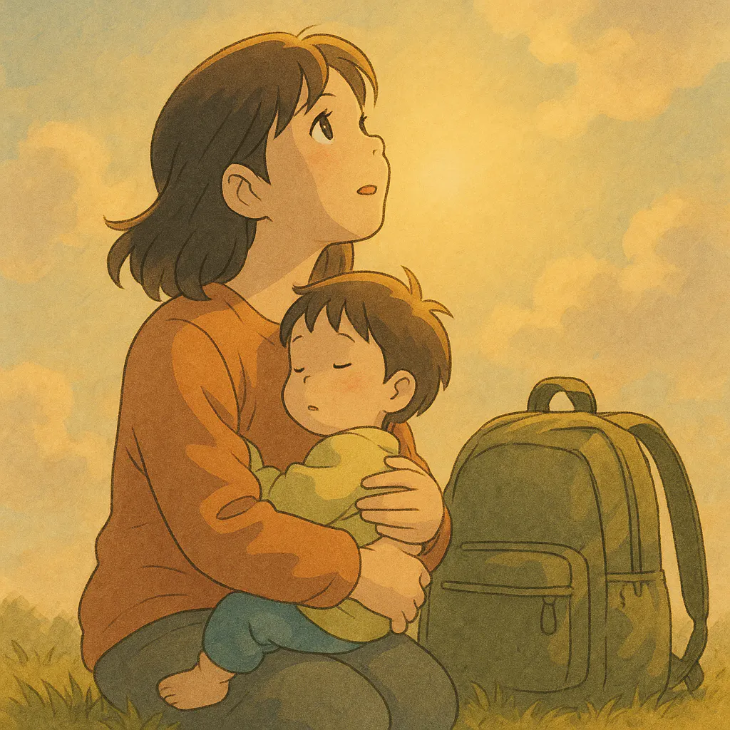 暗闇の中、子どもを抱え、階段を下り、周囲を確認しながら移動する。