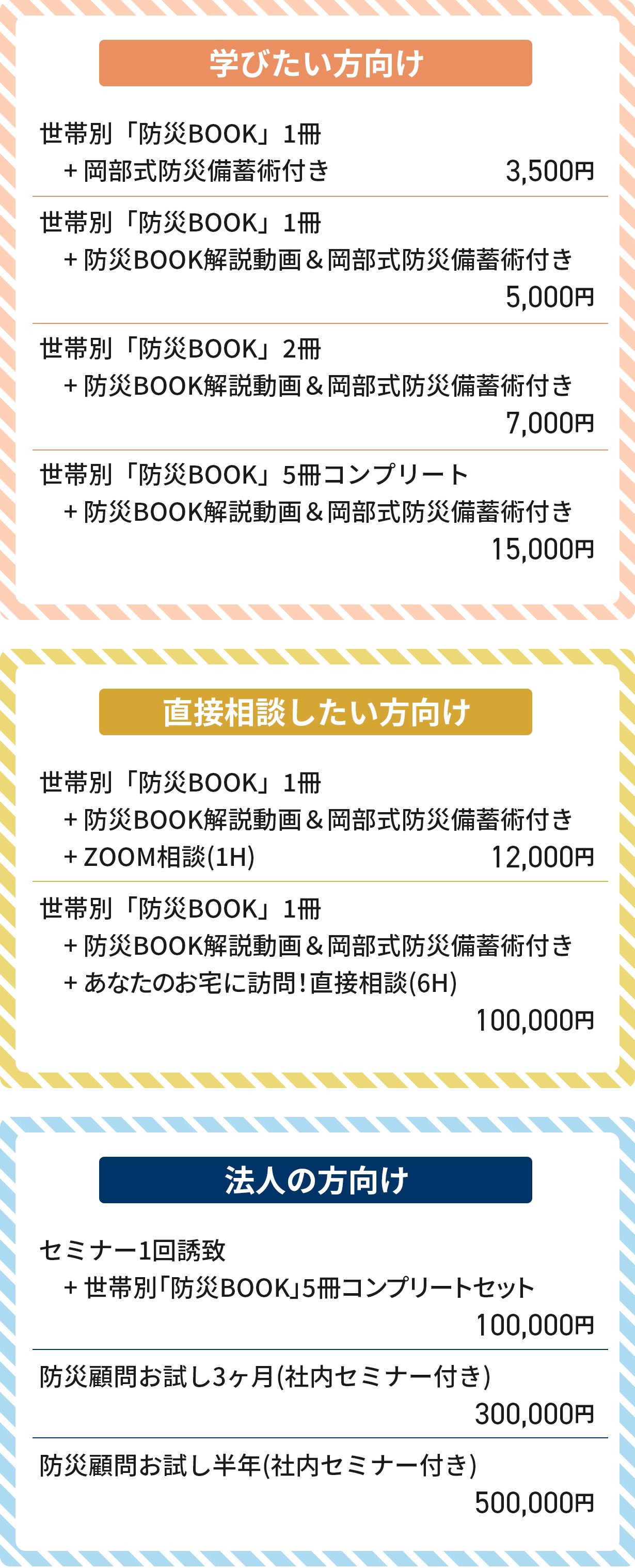 今回のクラウドファンディングでは、防災BOOKの他にもそれぞれの立場に合わせた“現実的な備え”をお届けします。
