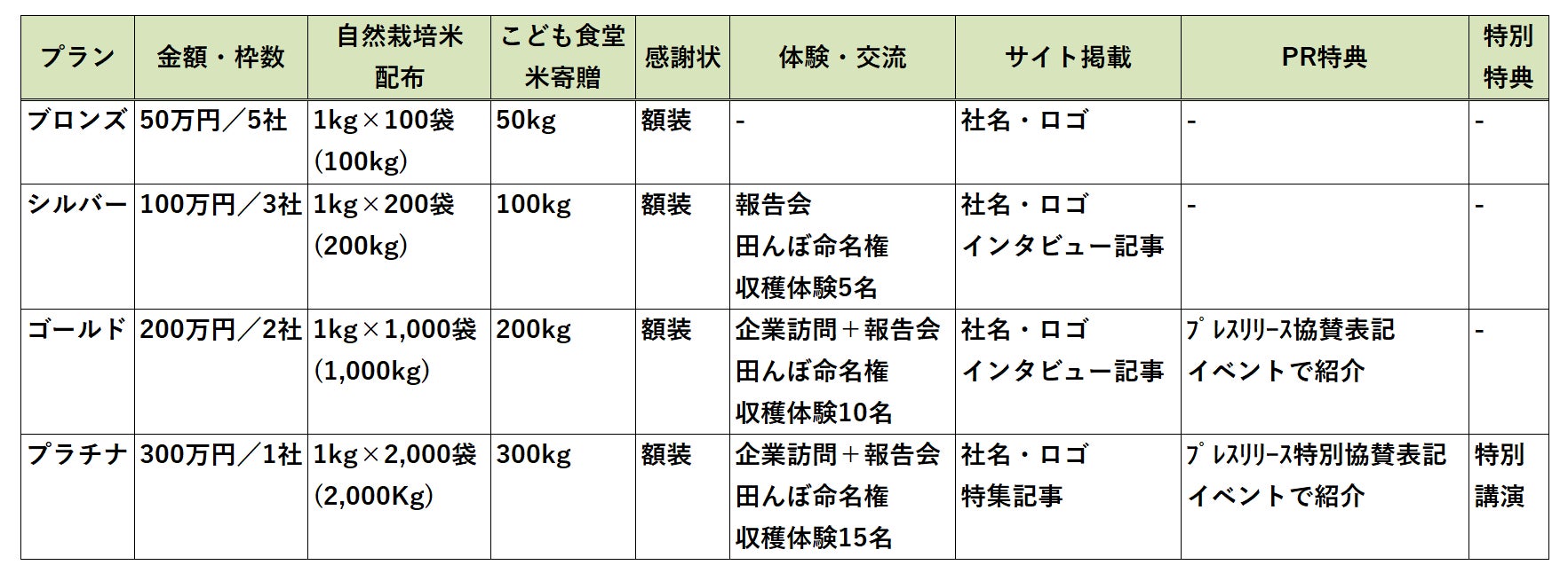 ※ゴールドとの差は、配布米1,000→2,000kg、こども食堂200→300kg、収穫体験10→15名、⑩が追加。