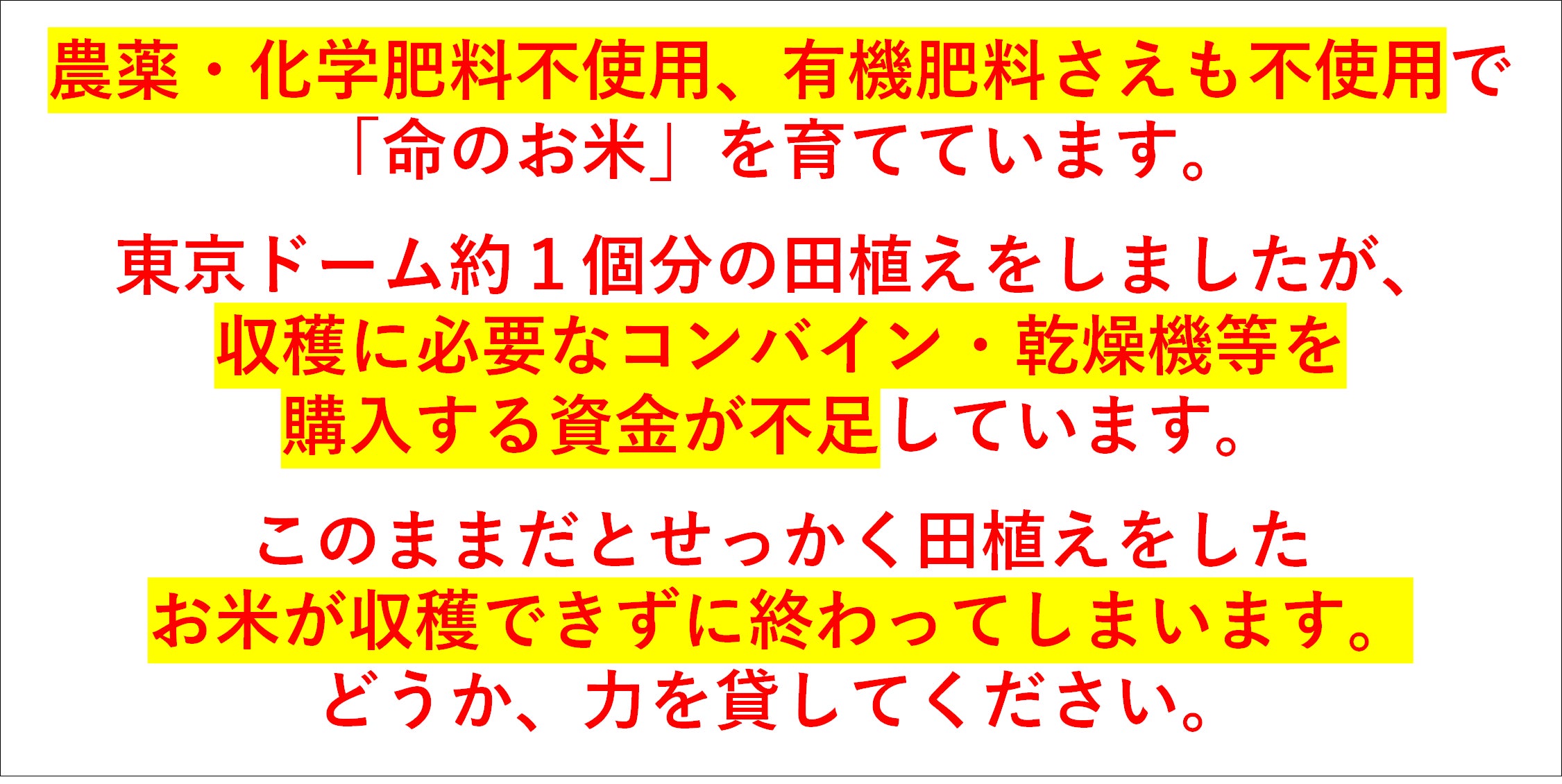 2025/10/01 21:55日本再生農業のクラウドファンディングにご支援いただいた皆さま、そしてプロジェクトページに♡お気に入り登録をしてくださった皆さまへ。8月にAll or Nothingで挑戦したクラウドファンディングから季節も移り変わり、田んぼの収穫作業もいよいよ終盤を迎えています。皆さまも日々元気にお過ごしのことと思います。前回は本当にたくさんのご支援をいただきながらもサクセスに届かず、リターンをお届けできなかったことが心残りでなりません。あらためてお詫び申し上げます。それでも私たちの想いはまったく揺らいでいません。「自然栽培米を日本中で当たり前に食べられるようにしたい」――そのために、農薬も肥料も使わないお米づくりを全国の田んぼに広げていく。その目標に向かって、少しずつですが確実に歩みを進めています。そして前回の挑戦を振り返りながら、どうすればもっと多くの人に想いを届けられるのか、どうやったら仲間の輪を広げられるのかを、チームで何度も話し合ってきました。その結果として――いよいよ、この度リベンジクラファンに挑戦することに決めました。\今日あなたは何を選択しますか?お茶碗一杯の選択から、子どもたちの未来を変えたい!/URL:https://camp-fire.jp/projects/890251/view2025年10月31日(金)の23:59までご支援の輪を広げるために私たちの想いを一生懸命伝えていきますので、♡お気に入りの登録・シェア拡散・ご支援の協力をどうかお願いいたします。今度こそ、皆さまに自然栽培のお米をお届けできるよう全力で走り抜けます。どうかもう一度、この挑戦を一緒に盛り上げていただけたら嬉しいです!日本再生農業スタッフ一同 もっと見る