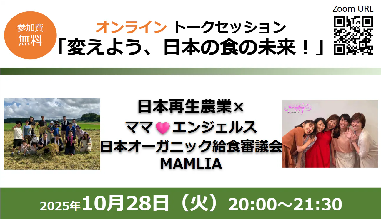 2025/10/28 18:19クラファンスペシャル無料トークセッションを開催します!学校給食オーガニック化を実現したママさんたちの消費者団体、ママ♡エンジェルスのママさんたち、またその仕組み作りをした平山さんと、日本再生農業の山口代表との超豪華クラファンスペシャルのコラボセミナーです!ゲスト①:平山秀善 慶応ビジネススクール卒業MBA取得ノーネス(株)代表取締役ママエンジェルスチェアマン飲食業、キッチンカー、中小企業、災害対策など様々な審議会を設立し、法律や予算獲得や制度改正など数々の実績を持ち、スーパーダイレクトデモクラシー 市民立法の第一人者と言われるゲスト②:ママ♡エンジェルス https://mama-angels.com/日本最大を目指す4000人のママを中心とする消費者団体オーガニック給食やワクチンの選択性など農水省や厚生労働省と様々な制度を作ってきたオーガニック給食では、政府としての予算獲得や世田谷区、名古屋市での独自予算での実現を推進した日本再生農業&MAMLIA &ママ♡エンジェルス トークセッション「変えよう、日本の食の未来!」開催日時は10月28日(火)20時~21時30分!20:00 司会挨拶20:05 「望む未来の創り方〜市民の力で行政と議員を動かす方法〜」(平山)20:15 実践例① キッチンカー経営審議会による災害食(山口)20:25 実践例② ママエンジェルスによる学校給食オーガニック化(ママエンジェルス)20:45 ママエンジェルスによる新たな取組 マムリアとは?(平山・ママエンジェルス)21:00 日本再生農業の取組~四方良しで日本の食と農を守る~(山口)21:30 終了、希望者のみ質問&交流22:00 完全終了■オンライン セミナー詳細日時:2025年10月28日(火)20:00-21:30場所:オンライン(Zoom)会費:無料 申込:不要。時間になりました下記へアクセスしてください。Zoom URL:https://x.gd/fFtFd ミーティング ID 852 0138 8163 パスコード 588395お茶碗一杯の選択から、こどもの笑顔を守る。日本再生農業のチャレンジにエールを!◍山口 純司 代表のSNSアカウントFacebook https://www.facebook.com/tacoshacho358Instagram https://www.instagram.com/tacoshacho358X(エックス) https://x.com/tacoshacho358◍日本再生農業 オフィシャルアカウントInstagram https://www.instagram.com/rebirthjapan/ もっと見る