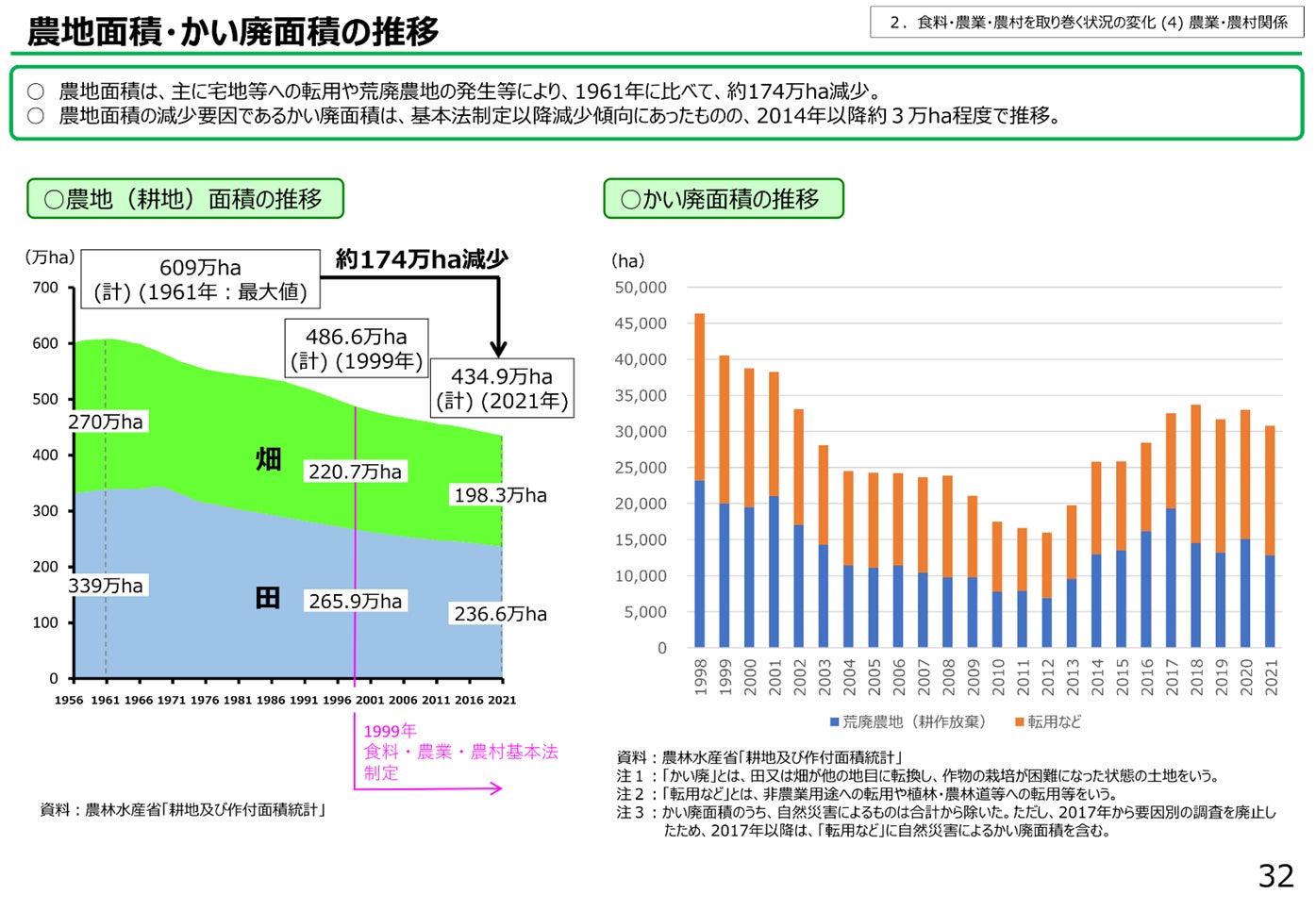農地面積は、主に「宅地等への転用」や「荒廃農地の発生等」により、1961年に比べて、約174万ha(1/4以上)減少しています。