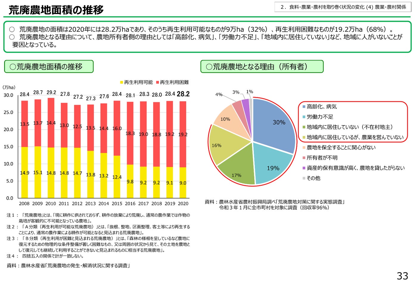 荒廃農地の面積は2020年には28.2万haであり、そのうち再生利用可能なものが9万ha(32%)、再生利用困難なものが19.2万ha(68%)となっています。