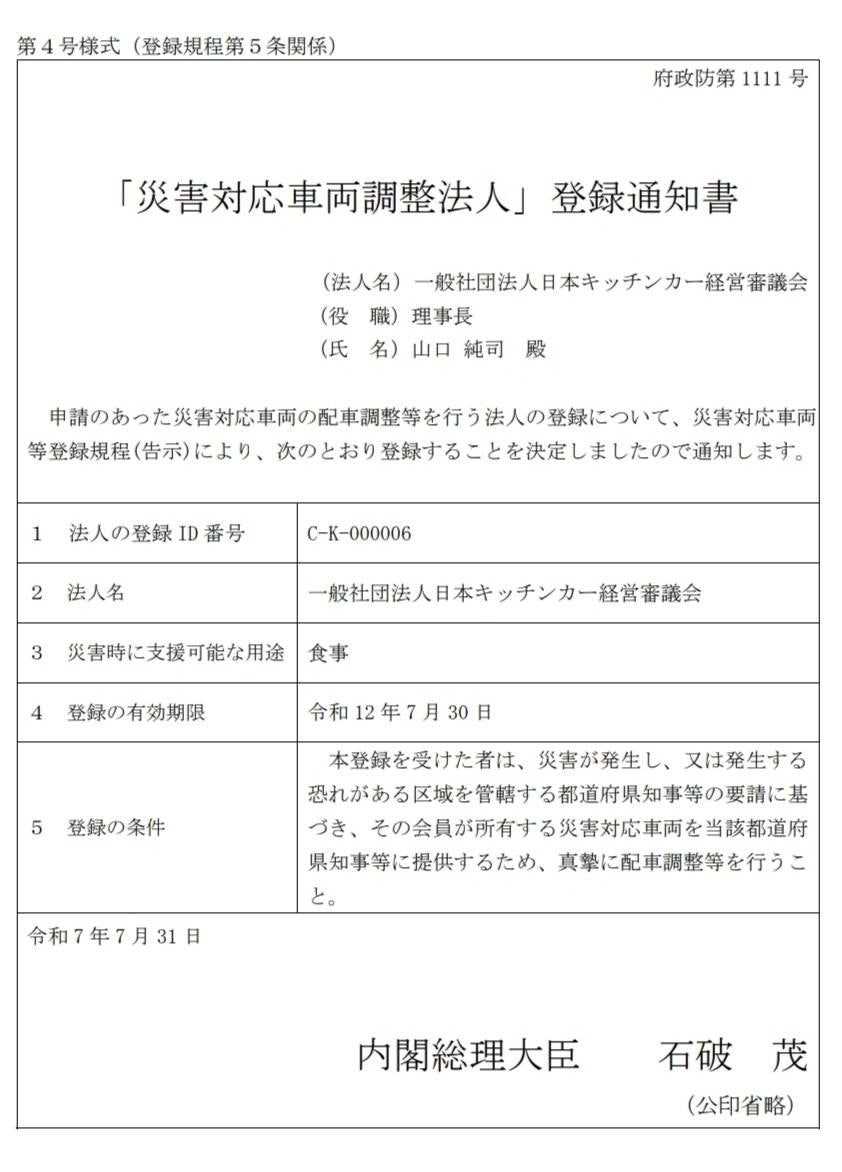災害時のキッチンカーの差配をする法人として内閣府に登録されました。