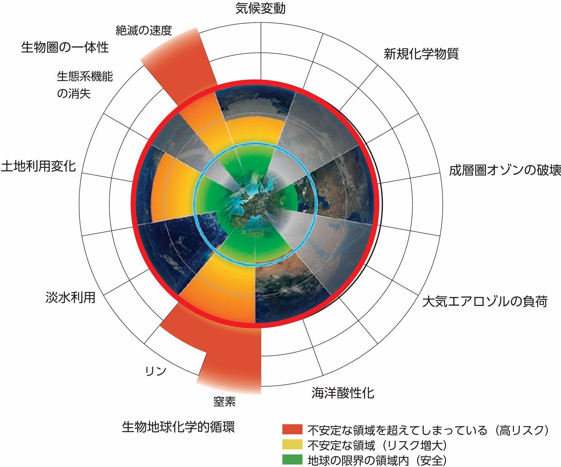 9つの環境要素のうち、2009年にストックホルム・レジリアンス・センターの研究者らが、「種の絶滅の速度」と「窒素・リンの循環」については、不確実性の領域を超えて高リスクの領域にあると報告しました。※2023年に内容追加