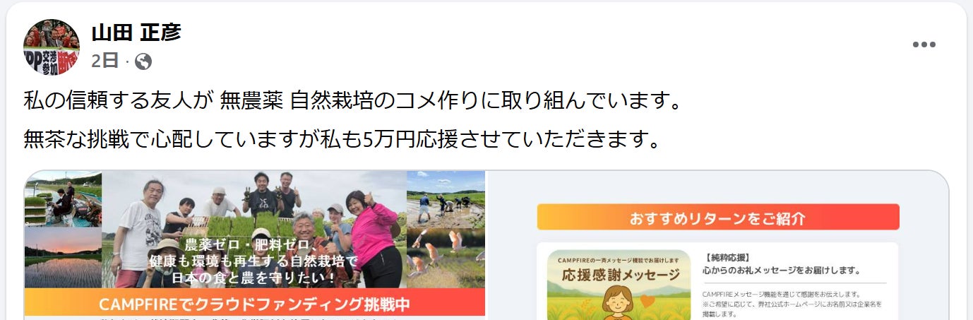 2025/10/01 21:55日本再生農業のクラウドファンディングにご支援いただいた皆さま、そしてプロジェクトページに♡お気に入り登録をしてくださった皆さまへ。8月にAll or Nothingで挑戦したクラウドファンディングから季節も移り変わり、田んぼの収穫作業もいよいよ終盤を迎えています。皆さまも日々元気にお過ごしのことと思います。前回は本当にたくさんのご支援をいただきながらもサクセスに届かず、リターンをお届けできなかったことが心残りでなりません。あらためてお詫び申し上げます。それでも私たちの想いはまったく揺らいでいません。「自然栽培米を日本中で当たり前に食べられるようにしたい」――そのために、農薬も肥料も使わないお米づくりを全国の田んぼに広げていく。その目標に向かって、少しずつですが確実に歩みを進めています。そして前回の挑戦を振り返りながら、どうすればもっと多くの人に想いを届けられるのか、どうやったら仲間の輪を広げられるのかを、チームで何度も話し合ってきました。その結果として――いよいよ、この度リベンジクラファンに挑戦することに決めました。\今日あなたは何を選択しますか?お茶碗一杯の選択から、子どもたちの未来を変えたい!/URL:https://camp-fire.jp/projects/890251/view2025年10月31日(金)の23:59までご支援の輪を広げるために私たちの想いを一生懸命伝えていきますので、♡お気に入りの登録・シェア拡散・ご支援の協力をどうかお願いいたします。今度こそ、皆さまに自然栽培のお米をお届けできるよう全力で走り抜けます。どうかもう一度、この挑戦を一緒に盛り上げていただけたら嬉しいです!日本再生農業スタッフ一同 もっと見る