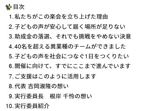 2025/10/19 13:17越谷市こども子育て楽会 代表の吉岡淑隆です。このたびは、クラウドファンディング「助成金は落選。でも『こども子育て楽会』を必ず実現したい」にご支援・ご協力いただいた皆さまに、心より感謝申し上げます。皆さまのお力添えにより、第一回 越谷市こども子育て楽会 in 叡明高等学校 を無事に開催することができました。「こども達の声を聴く、こども達の声を届ける、子育て支援者が繋がる」。初めての試みで、何をどうすればいいのか、すべてが手探りのスタートでした。実績もなく、自治体からの協力もなかなか得られず、申請した助成金もすべて落選。それでも、「この楽会を実現したい」という想いで進めてきました。そんな私たちを支えてくださったのが、クラウドファンディングでの皆さまの温かいご支援でした。当日は、運営委員・協力者・ボランティア合わせて49名が参加。パフォーマンス出演者41名、出展ブース12店舗、来場者数は344名(おとな196名、こども148名)と、たくさんの方々にお越しいただき、盛大な大会となりました。会場では、巻物アンケートや展示など、さまざまな形でこども達の声があふれていました。ステージで想いを届けてくれた子、シンポジウムで勇気を出して語ってくれた子、保護者やスタッフに気持ちを伝えてくれた子――。そのひとつひとつの声に、私たちは何度も心を動かされました。この楽会は、こども達の声を「聴く」とはどういうことなのか、私たち大人が改めて考えるきっかけとなりました。そしてこれから、聴いた声をどう自治体や地域に届けていくのか、どう街づくりに活かしていくのかを、仲間と共に考え、行動していきます。「こども達に、生まれてきて良かったと思ってもらいたい。こども達が、生まれてきて良かったと、みんなに思ってもらいたい。」この想いを胸に、これからも私たちは歩みを進めてまいります。ご支援くださった皆さま、共に歩みましょう。どうぞ今後とも、ご支援・ご協力のほどよろしくお願い申し上げます。 もっと見る