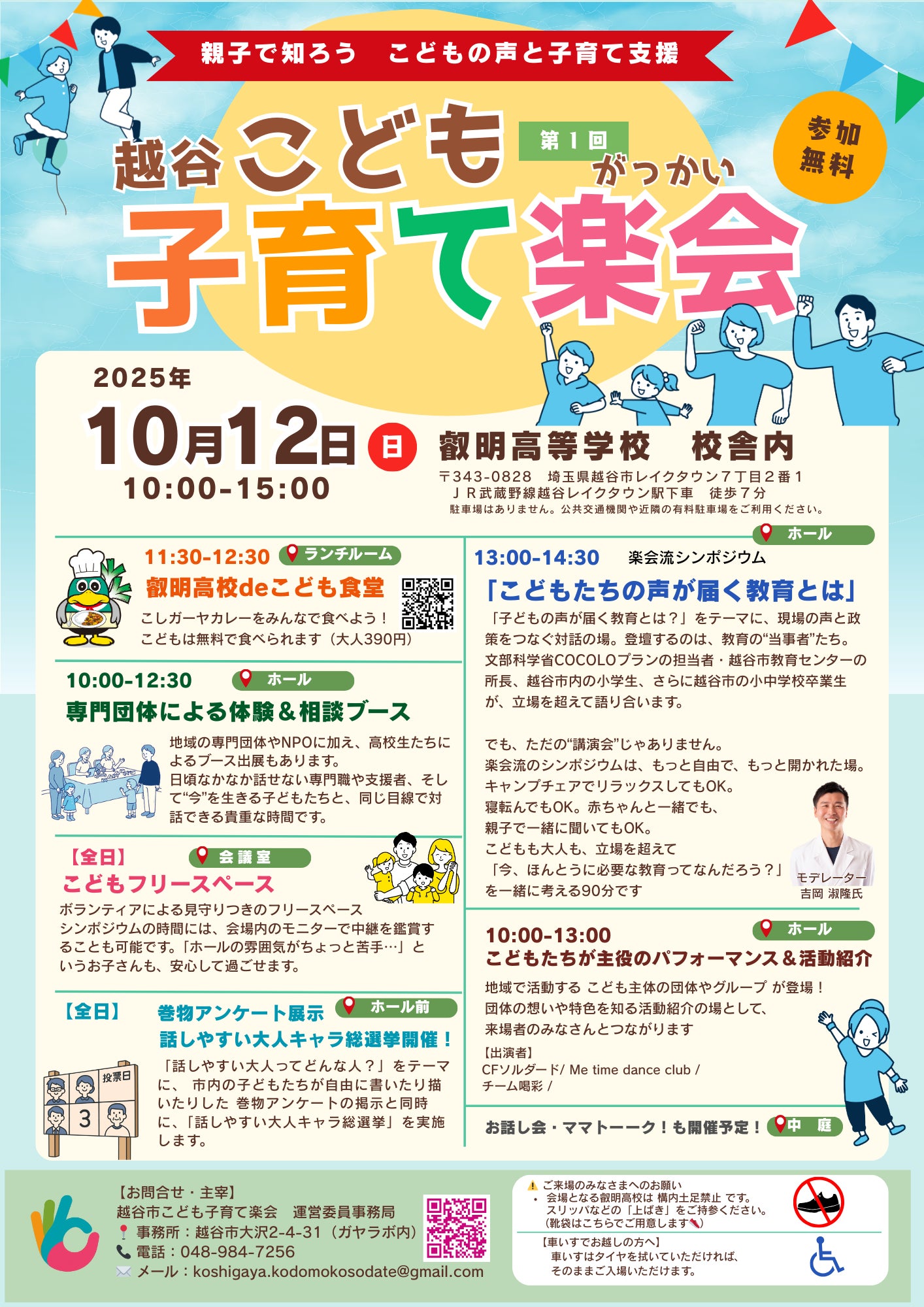 10月12日(日)、叡明高等学校を会場に、「第1回越谷市こども子育て楽会」を開催します。