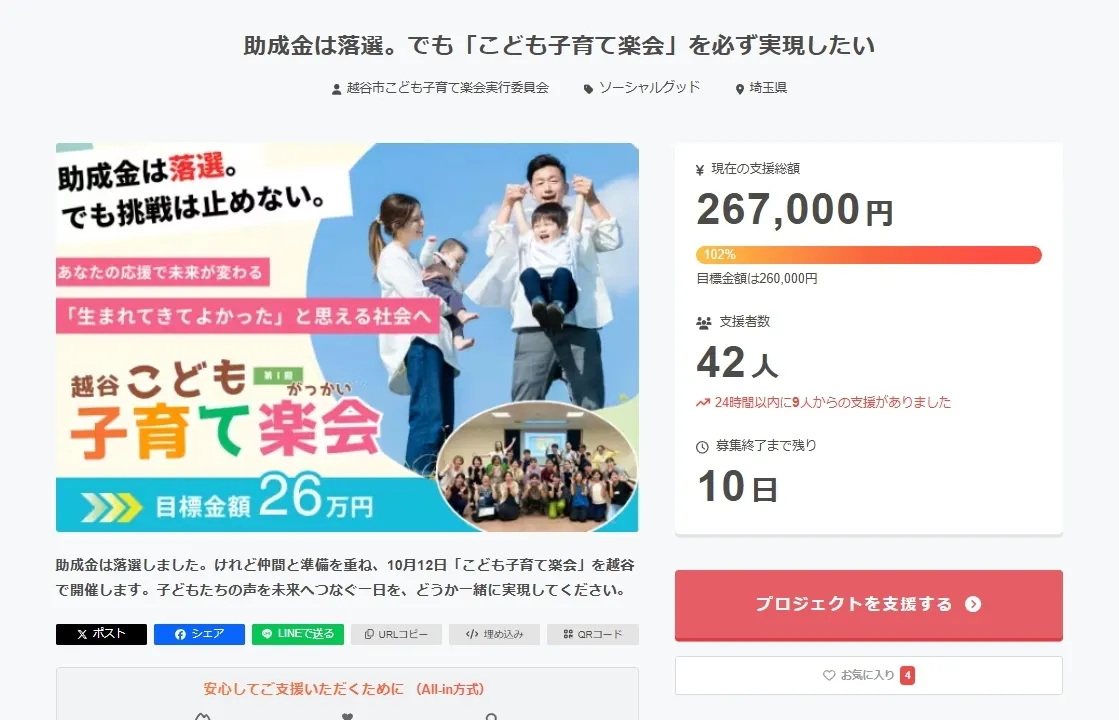 2025/09/27 13:329月24日よりスタートした「第1回 越谷市こども子育て楽会」クラウドファンディング。皆さまからの温かいご支援のおかげで、開始からわずか3日で 目標金額26万円を達成 することができました。心より感謝申し上げます。今回の達成は、私たちの挑戦に共感し、背中を押してくださった皆さまのお力の賜物です。本当にありがとうございます。ですが、これはゴールではなく スタートライン。いただいたご支援と御恩は必ず活動で返してまいります。ご支援の使い道は…・今年の楽会の内容をさらに充実させるため・次年度の楽会開催準備資金・広報物の充実 など「達成したから終わり」ではなく、「支援者が増えるほど、もっと子どもの声が広がり、応援ボードが賑やかになる」そんな広がりを皆さまと一緒に作っていきたいと思います。また、ご支援くださった皆さまのお名前やロゴは、10月12日(日)の会場内で掲示いたします。ぜひ当日、会場にも足をお運びください。クラウドファンディングは10月7日(火)23:59まで続きます。最後まで挑戦を続けてまいりますので、引き続き応援・ご支援を何卒よろしくお願いいたします。 もっと見る