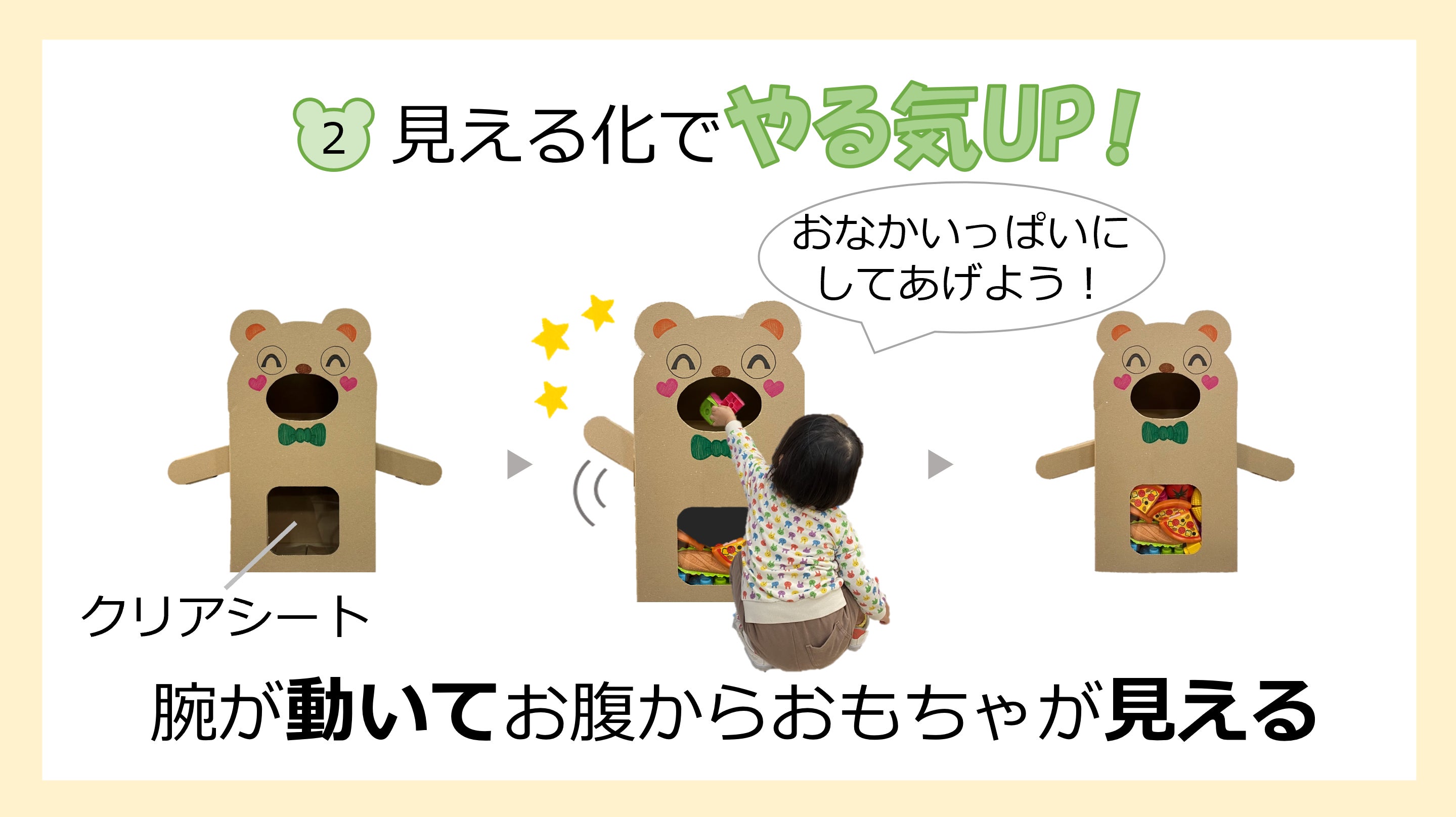 口の部分からおもちゃを入れるとシーソーのように腕が動きます。またクリアシートになっているお腹部分から入れたおもちゃを見ることができます。おもちゃを入れる度に腕が動く楽しさと、おもちゃがお腹に溜まっていく様子が見えることによって、片付けのやる気アップに繋がります。