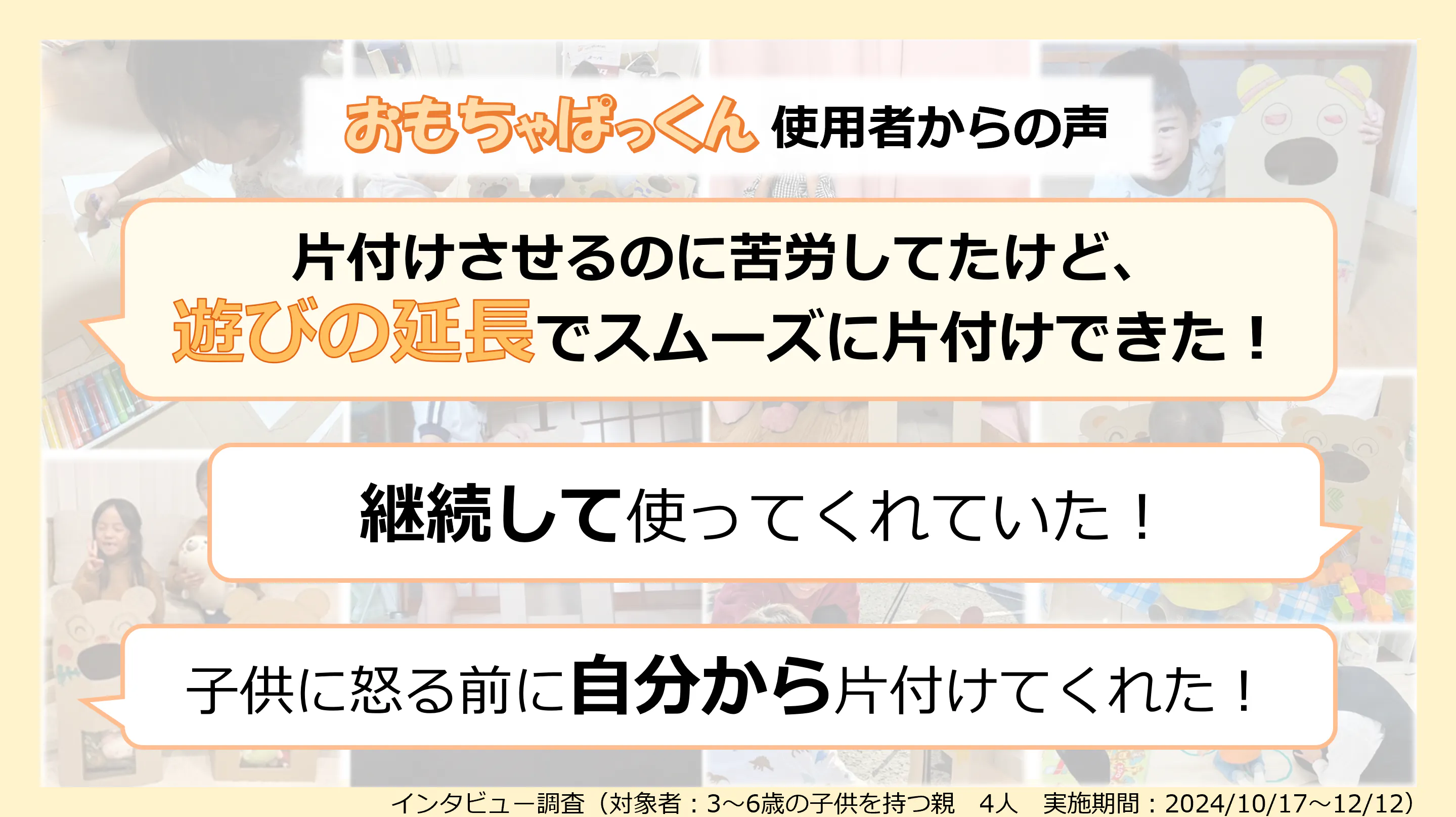 実際におもちゃぱっくんを使って頂いた方々からは、「片付けさせるのに苦労していたけど、遊びの延長でスムーズに片付けできた!」、「継続して使ってくれた」というような嬉しいお声を頂きました!