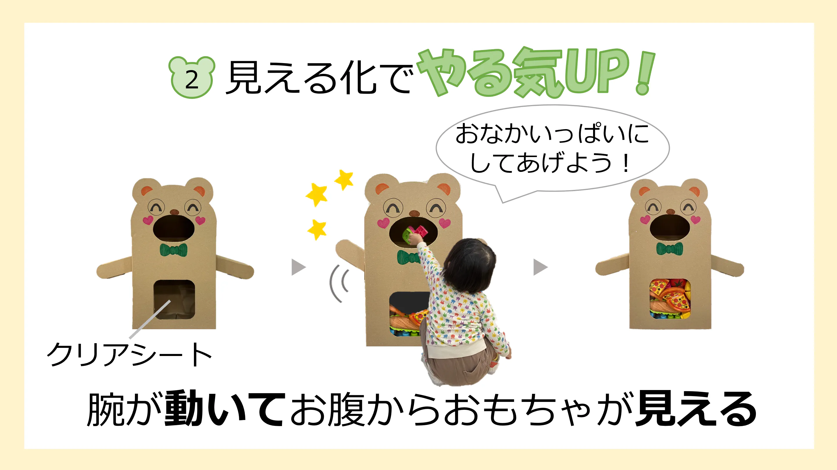 口の部分からおもちゃを入れるとシーソーのように腕が動きます。またクリアシートになっているお腹部分から入れたおもちゃを見ることができます。おもちゃを入れる度に腕が動く楽しさと、おもちゃがお腹に溜まっていく様子が見えることによって、片付けのやる気アップに繋がります。