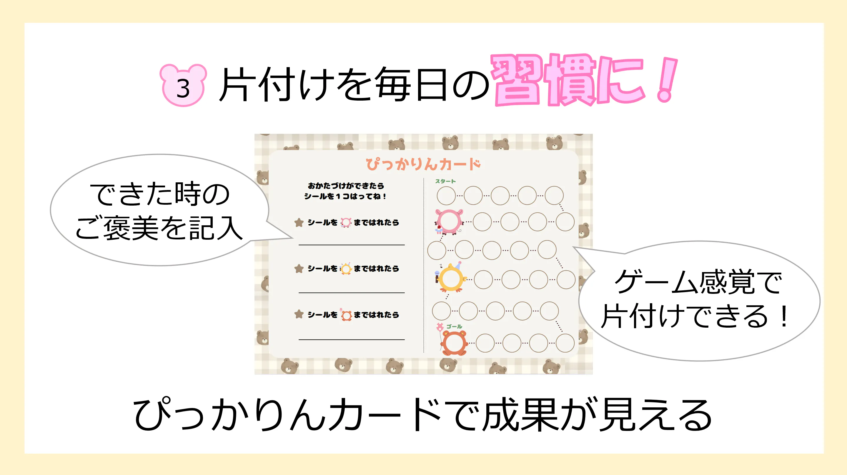 片付ける度に好きなシールを一枚貼ってもらうカードになっています。10個毎にご褒美をもらえるようになっており、達成した際のご褒美は自分で考えながら書いてもらいます。