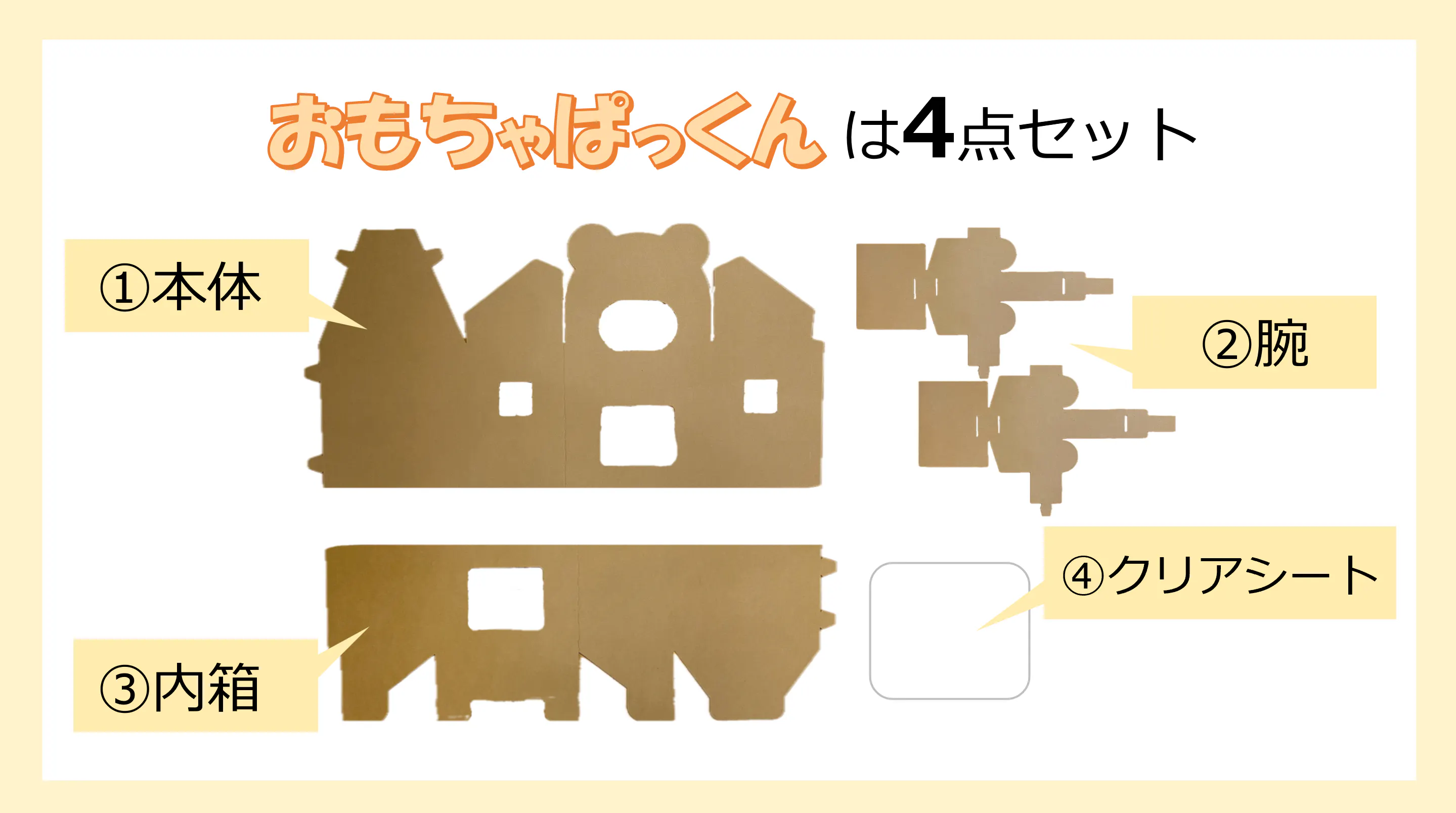 ①本体、②腕、③内箱、④クリアシートの4点セットで、それぞれを組み立てることでおもちゃ箱完成します。