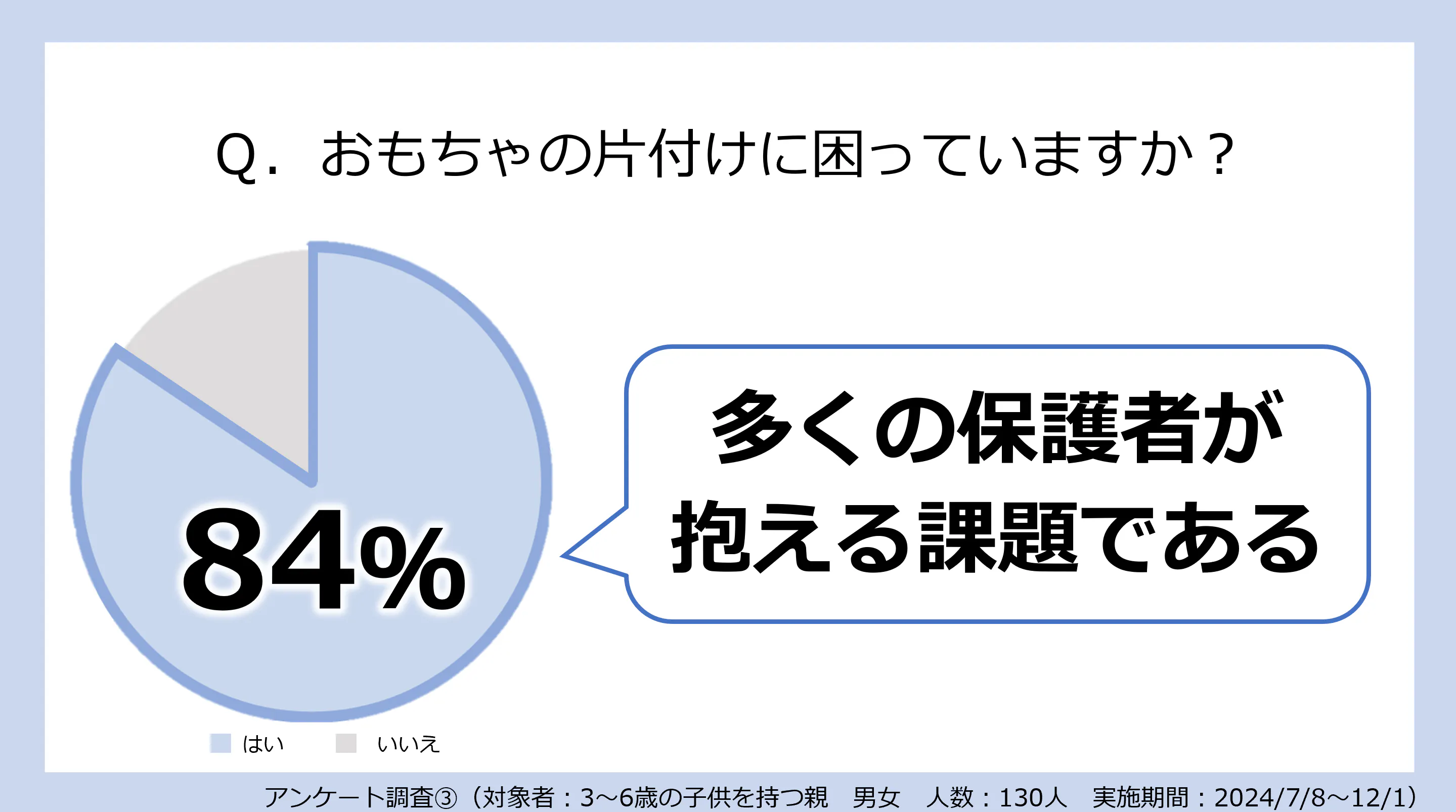 130人の保護者に子供のおもちゃの片付けに困っているか調査したところ、84%の方がおもちゃの片付けに困っていることが分かりました。