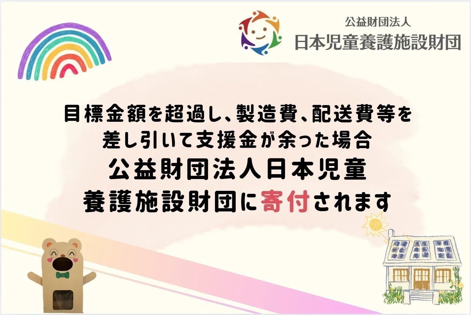 目標金額を超過し、製造費、配送費等を差し引いて支援金が余った場合、公益財団法人日本児童養護施設財団に寄付をし、児童養護施設の子どもたちの支援のために使われます。