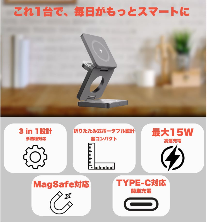 そんなあなたにこそ使ってほしいのが、Magnetic 3-in-1 ポータブルワイヤレス充電器です。