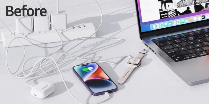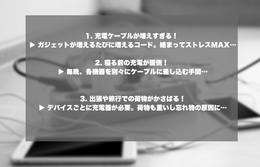 「スマホもイヤホンも腕時計も、毎晩別々に充電して面倒…」「ケーブルがデスクで絡まり、ゴチャゴチャして見た目も最悪…」「出張や旅行先で充電器3本+アダプター3個は重すぎる…」