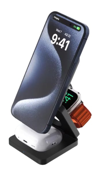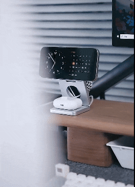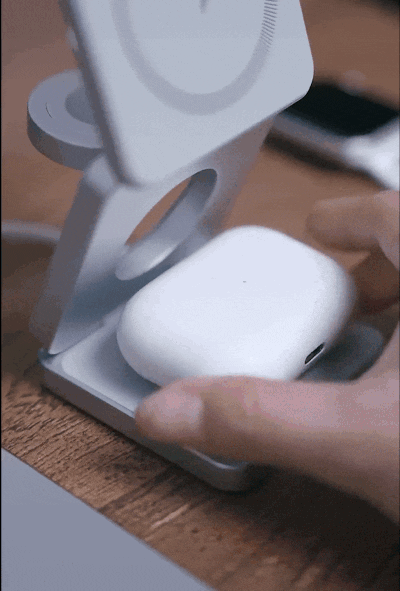 この3-in-1充電器は、“ただの充電器”ではありません。実は、iPhoneを設置する部分が角度調整可能なため、スマホスタンドとしても非常に便利に使えます。