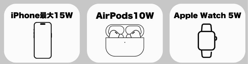 AirPodsは10W、Apple Watchは5Wの最適出力で安全かつ効率的にチャージ。