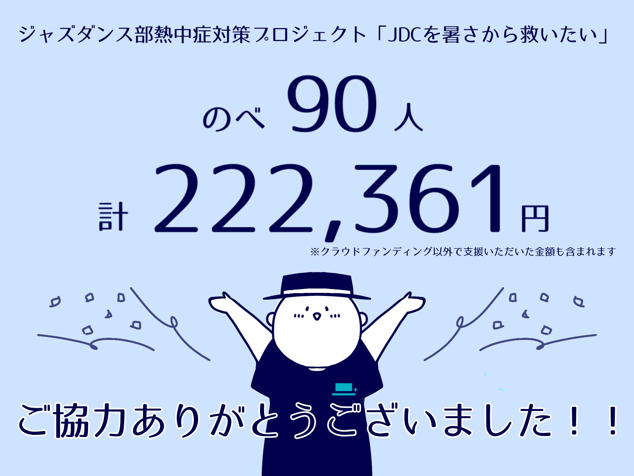 2025/09/01 10:43静岡県立大学ジャズダンス部の熱中症対策のため発足した当クラウドファンディング「JDCを暑さから救いたい」は、8/31をもって終了いたしました。のべ90人、計222,361円のご支援をいただくことができました!(我々運営に直接支援金を送付いただいたものも含まれます)ご支援くださった方、クラウドファンディングを広めてくださった方に心から感謝いたします。ありがとうございました。今回のプロジェクトで想像以上の方に支援していただくことができ、とても嬉しく思います。また、支援金とともに数多の温かいメッセージをいただきました。改めてジャズダンス部のつながりの強さを実感しました。これからも現役生が新たな歴史を紡いでくれる事と思います。いただいた支援金の利用方法などにつきましては、経過報告を含めクラウドファンディングサイトの「活動報告」で主に発信していきます。改めまして、ご協力くださった全ての方々、ありがとうございました。 もっと見る