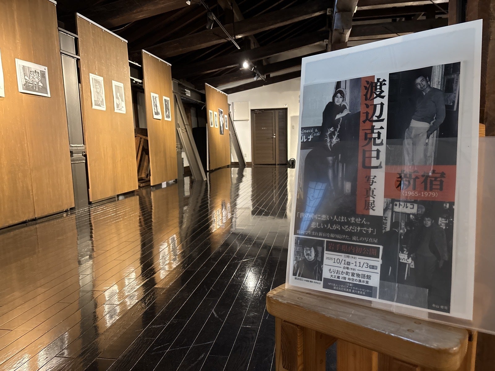 坂田理事長は、ご自身大学時代には東京にて演劇活動をされており、当時の新宿の雰囲気をわかっていらっしゃる方でした。NPOいわてアートサポートセンターは、その名の通り、街の文化、芸術のサポートをする団体であり、かつ坂田理事長を中心とした演劇集団でもあり、理解をしていただくのに時間はかかりませんでした。令和7年・2025年は、昭和100年であり、戦後80年でもあります。NPOいわてアートサポートセンターが管理・運営を委託されている、もりおか町家物語館での2025年のテーマは「昭和」。令和のこの時代に、古くも温かみのある「昭和」を振り返るテーマに、渡辺克巳さんの「新宿」の写真は合致したのでした。