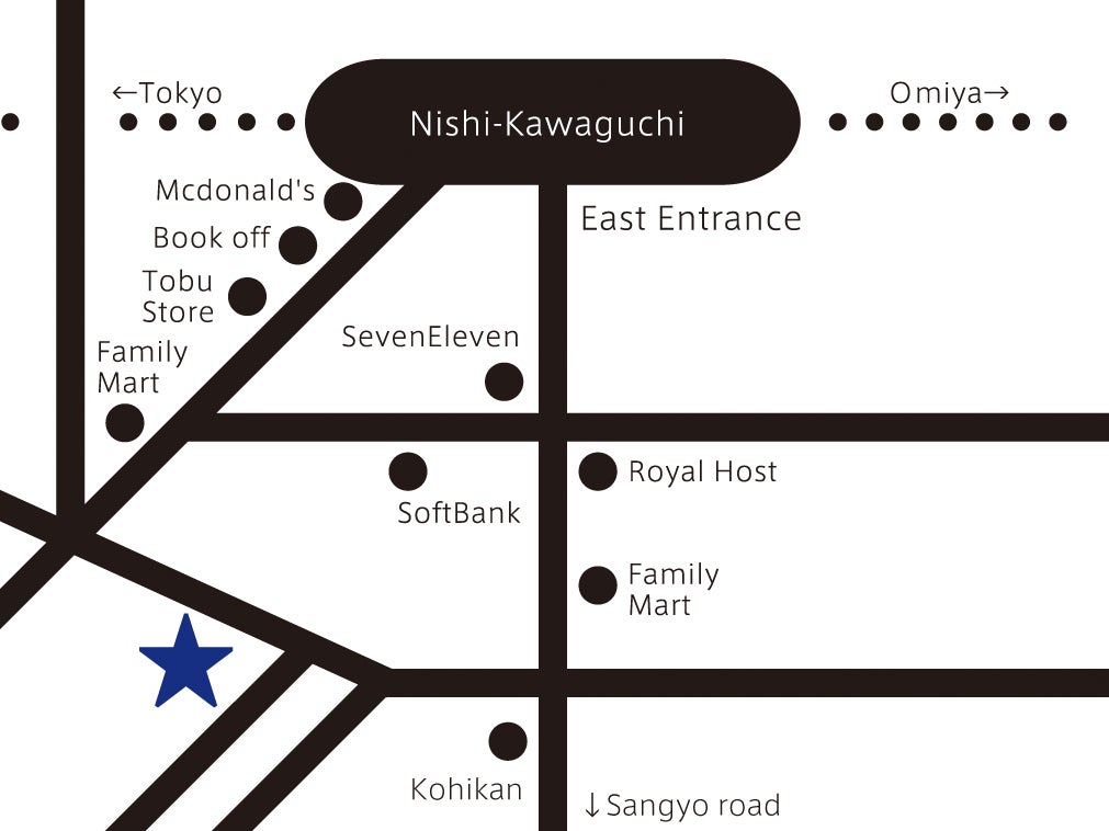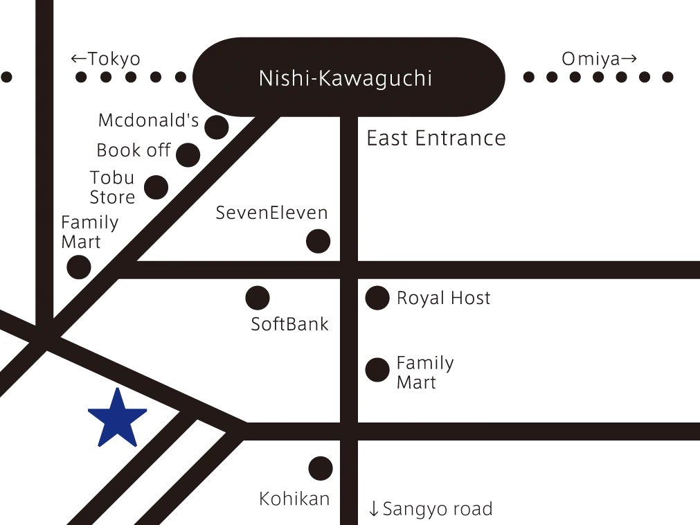 京浜東北線 西川口駅 東口下車。ロータリーを右手に行き東武ストアを右手に見ながら最初の信号を左。徒歩5分。