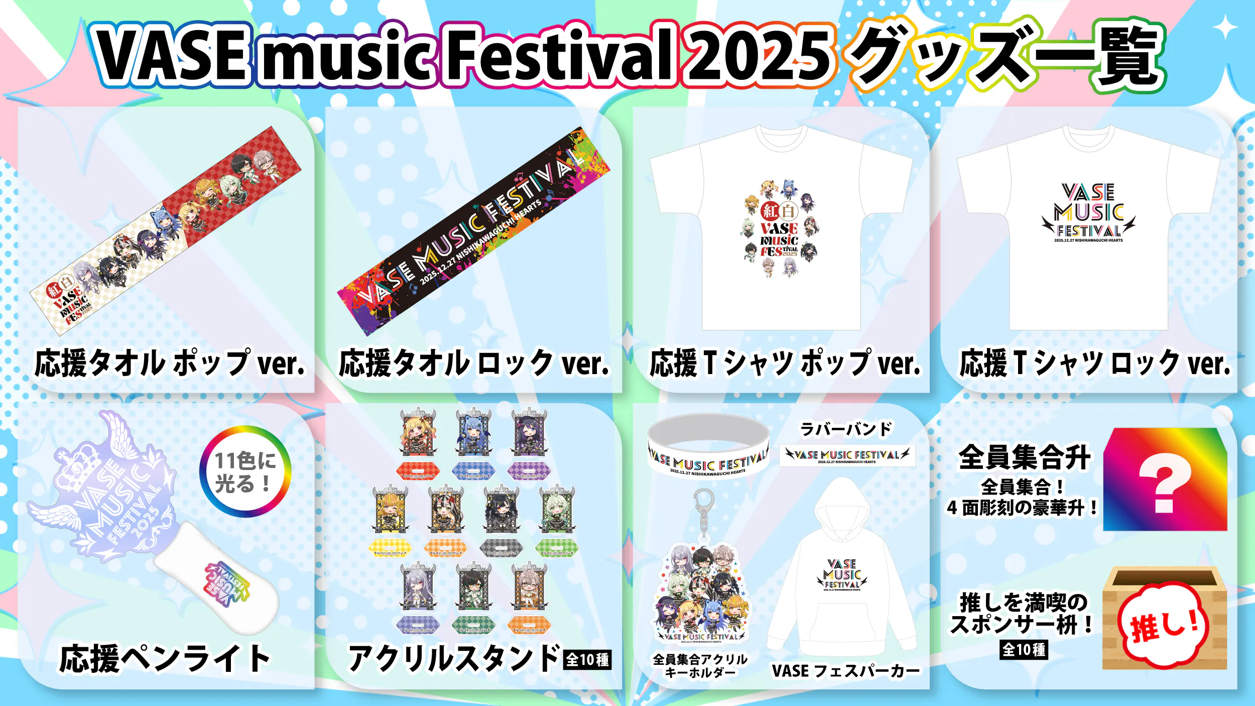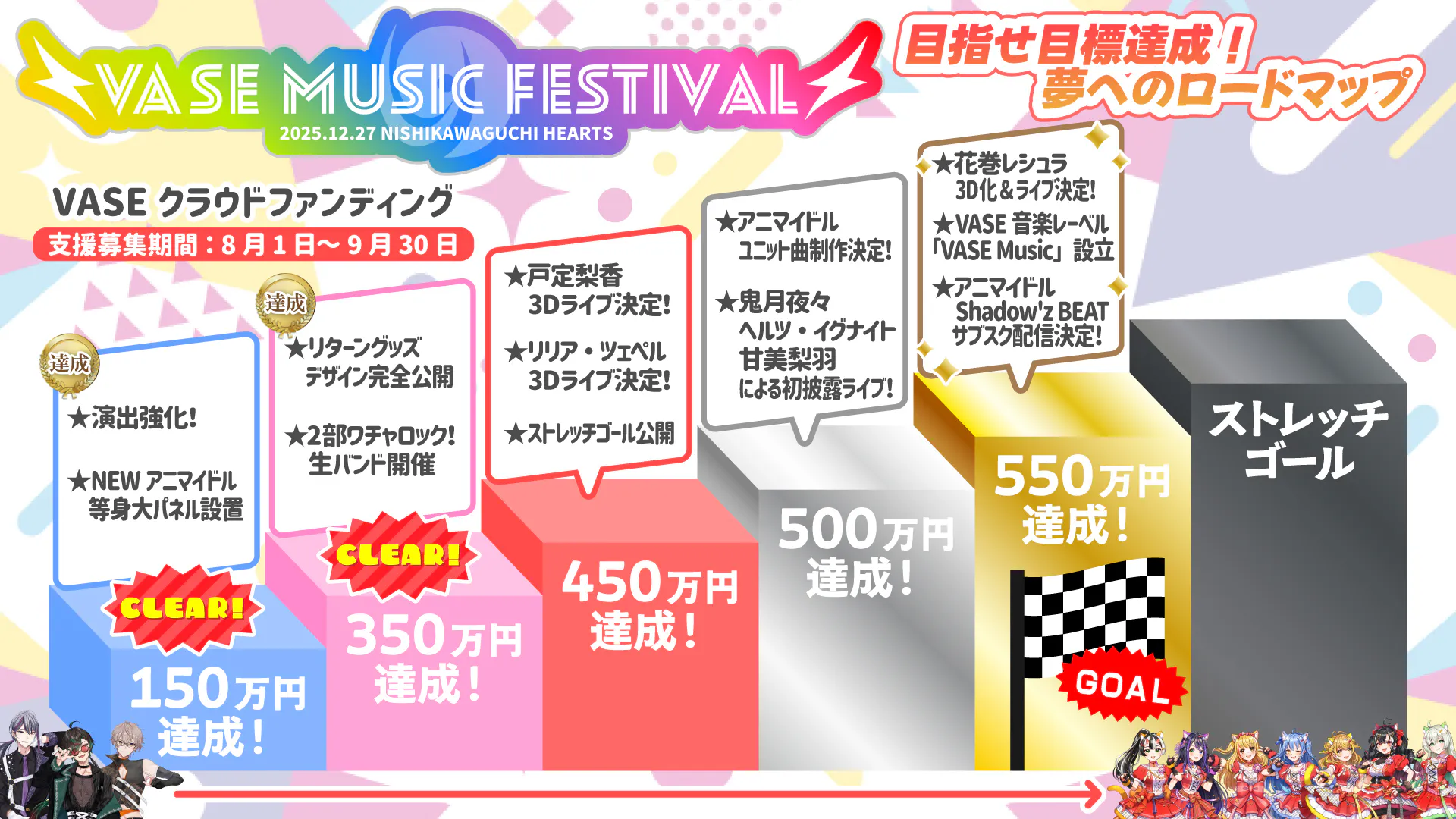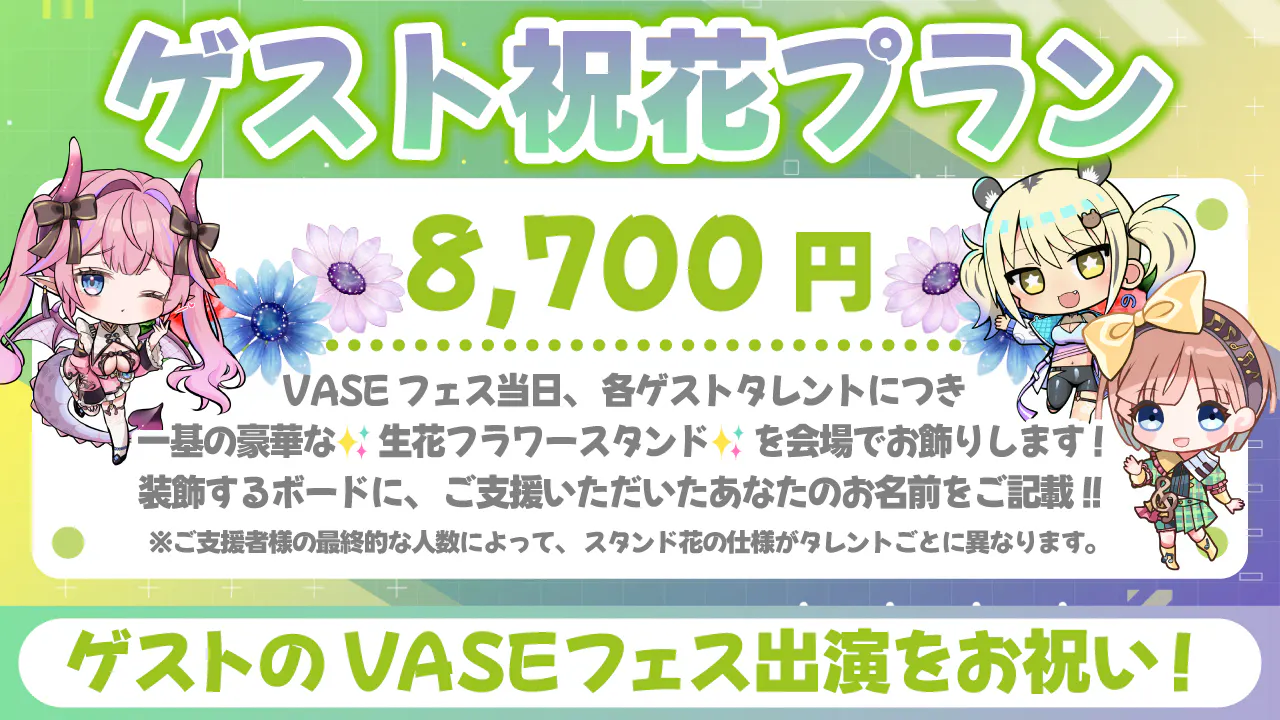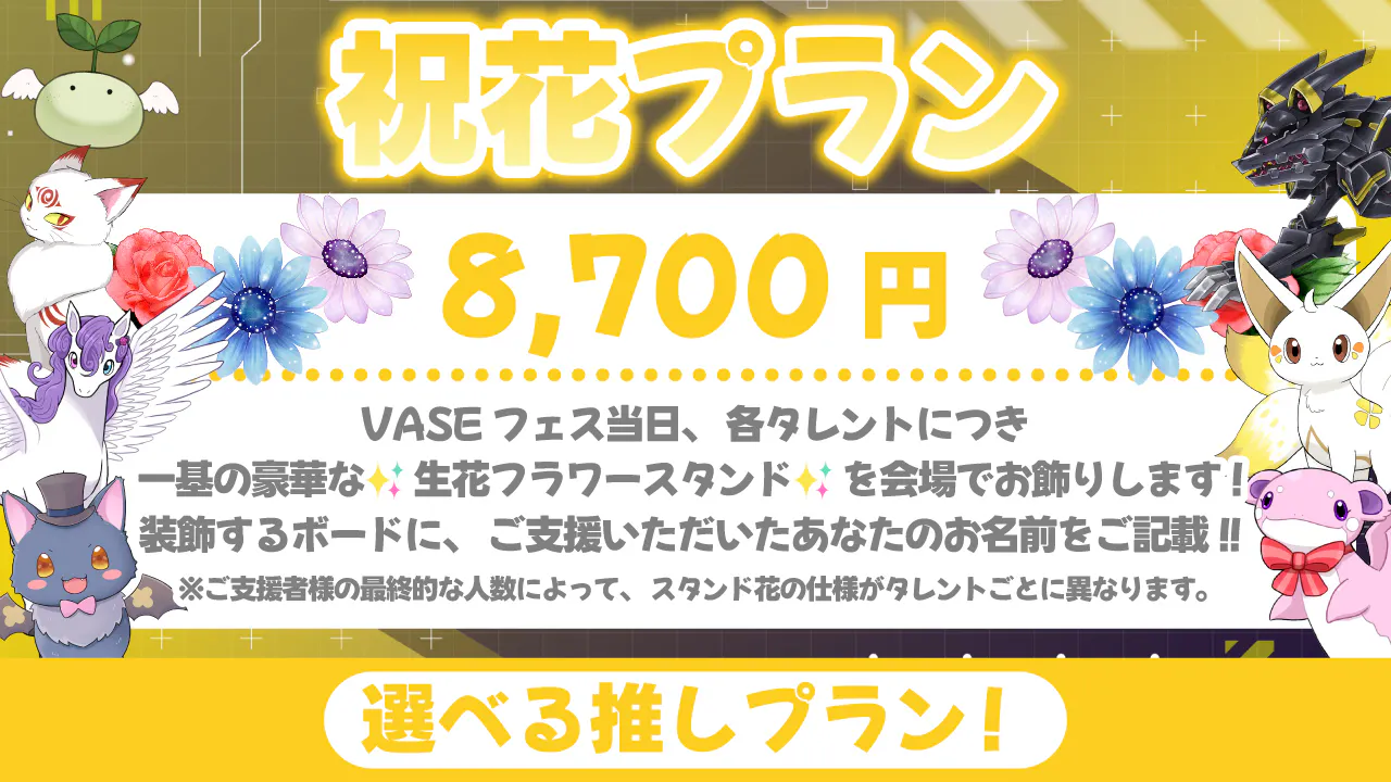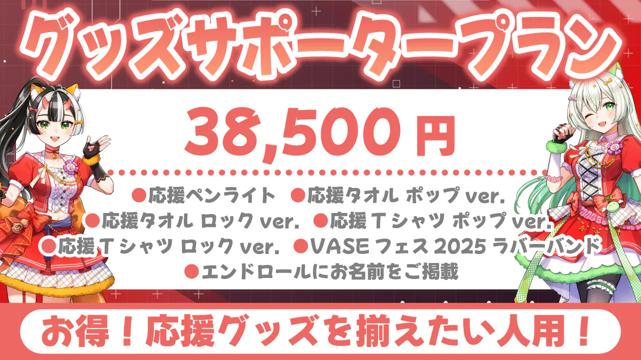 2025/09/26 20:55VASEフェス2025クラウドファンディングに、温かい応援をいただきまして誠にありがとうございます。現在の支援総額は 3,766,700円(68%達成)、113名の皆さまにご支援をいただいております。昨日9月25日の配信にて、皆さまからのご支援により 支援総額350万円を突破 いたしました!改めて心より感謝申し上げます!昨日の配信はこちらからご覧いただけます。 ついにロードマップの第二目標を達成し、グッズデザインを公開することができました!【公開となったグッズデザイン】★応援タオル ポップver.★応援Tシャツ ポップver.★アクリルスタンド★全員集合アクリルキーホルダー華やかなアイドル衣装に身を包んだタレントたちの姿は、クラウドファンディングへのご支援リターンでのみお迎えいただける限定デザインです。会場での販売はございませんので、この機会をぜひお見逃しなく。ここまで応援してくださったすべての皆さまに、心より感謝申し上げます。続いて、フラワースタンドの最新状況をご報告いたします。ご支援数に応じて仕様がグレードアップする本企画ですが、多くの温かい想いをお寄せいただいております。【生花フラワースタンド】(9/25時点)【デジタルフラワースタンド】(9/25時点)皆さまからの一つひとつのご支援が、当日のステージを彩る大切な力となっております。改めて心より御礼申し上げます!そして最後に、大切なお知らせです。昨日の配信でも発表いたしました通り、リアルライブ「VASEフェス」の開催は本年をもって最後となります。公式配信から始まり、昨年・本年と2年続けてリアルライブとして開催してきた「VASEフェス」。多くの皆さまに応援いただき、VASEの一大イベントへと成長してまいりましたが、リアルライブとしてのVASEフェスはここで幕を下ろすこととなりました。タレント・スタッフ一同、最高の一夜をお届けできるよう全力で準備を進めております。その瞬間を、ぜひ皆さまと一緒に迎えられますよう願っております。クラウドファンディングもいよいよ終盤です。最後まで引き続きのご支援・応援を、どうぞよろしくお願いいたします。 もっと見る