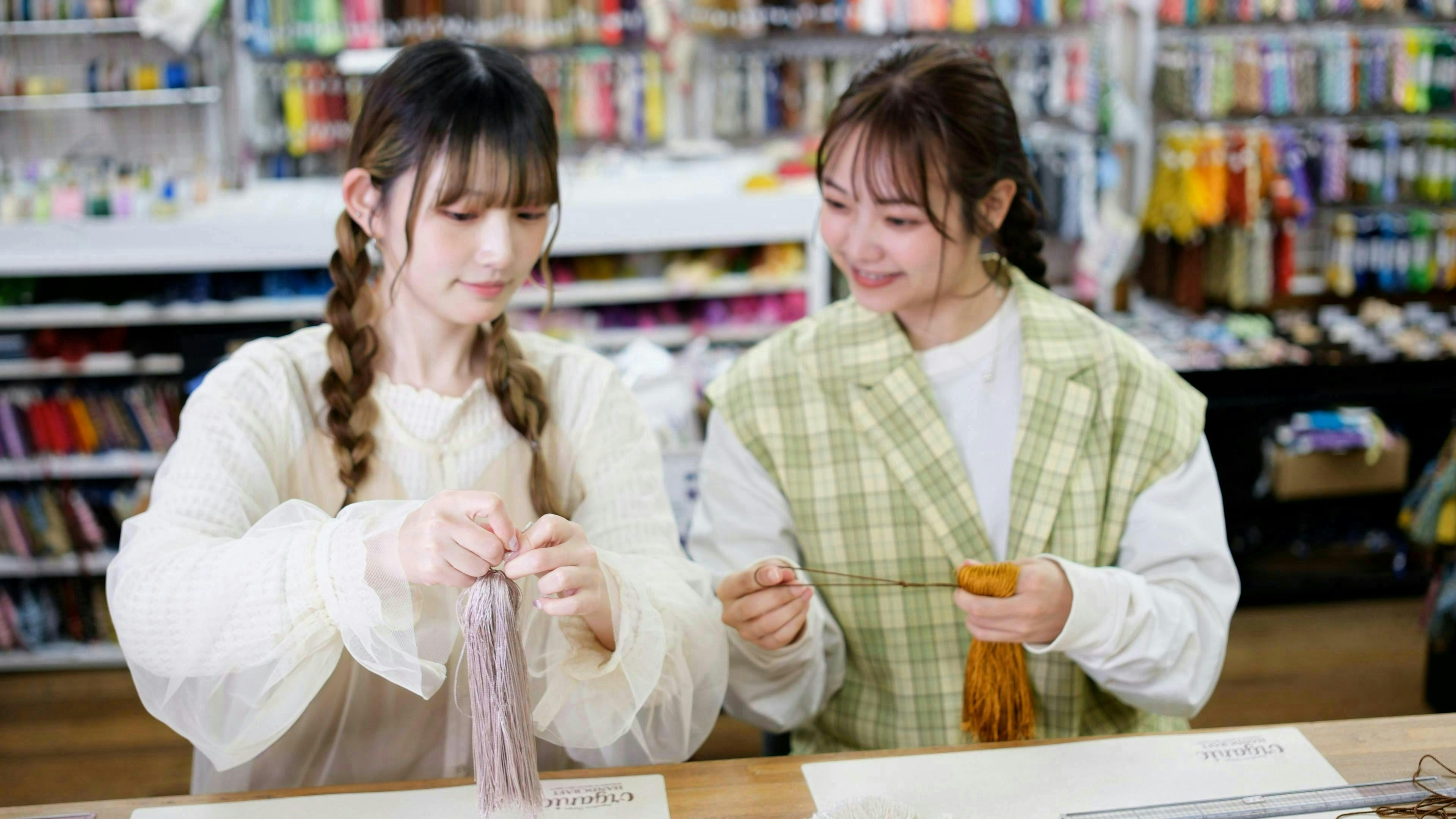 店舗のすぐ近くには自社工房があり、そこで染色を行い、オリジナルカラーの手芸素材を製造しています。店内では、それらの素材を中心に、手芸好きの皆さまに向けた素材商品の販売や、ワークショップの開催も行っており、たとえば学生さんがタッセルづくりにチャレンジしてくださるなど、幅広い世代の方々に手芸の楽しさを体験していただいています。