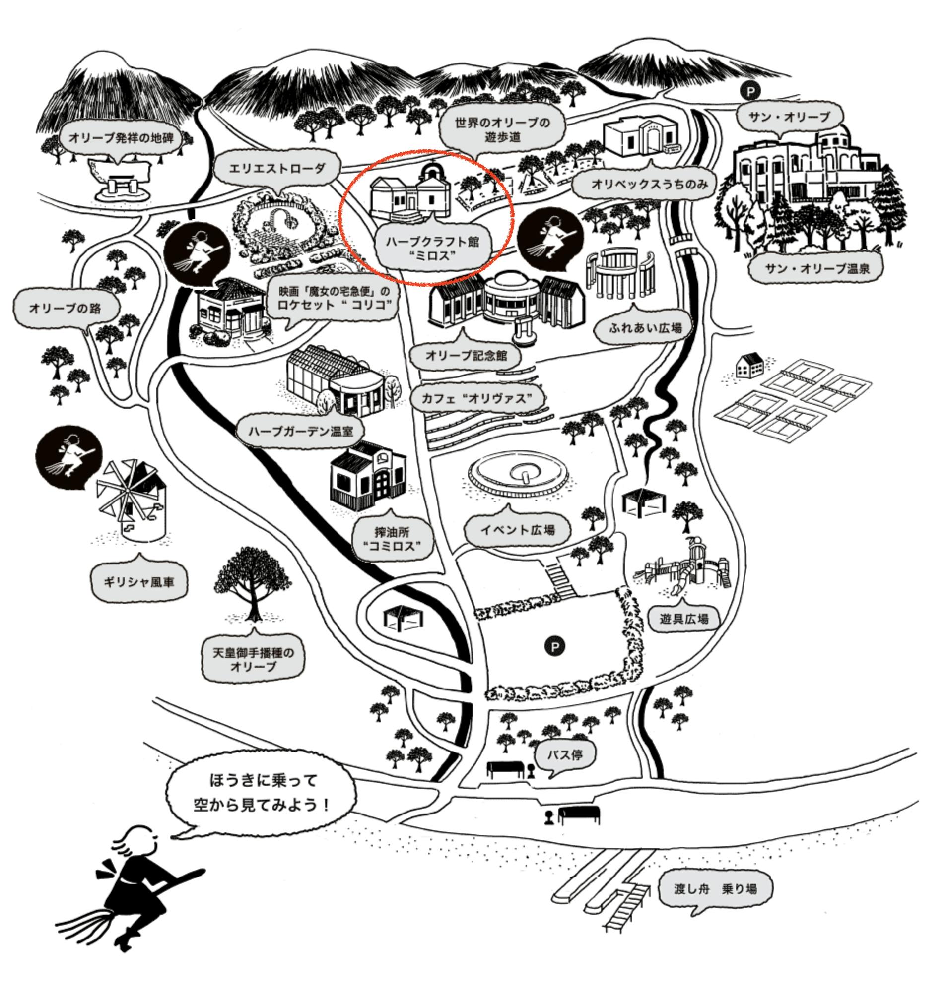 ▼小豆島オリーブ公園の園内図。ワークショップ会場はミロス館。オリーブ記念館の奥の建物です。