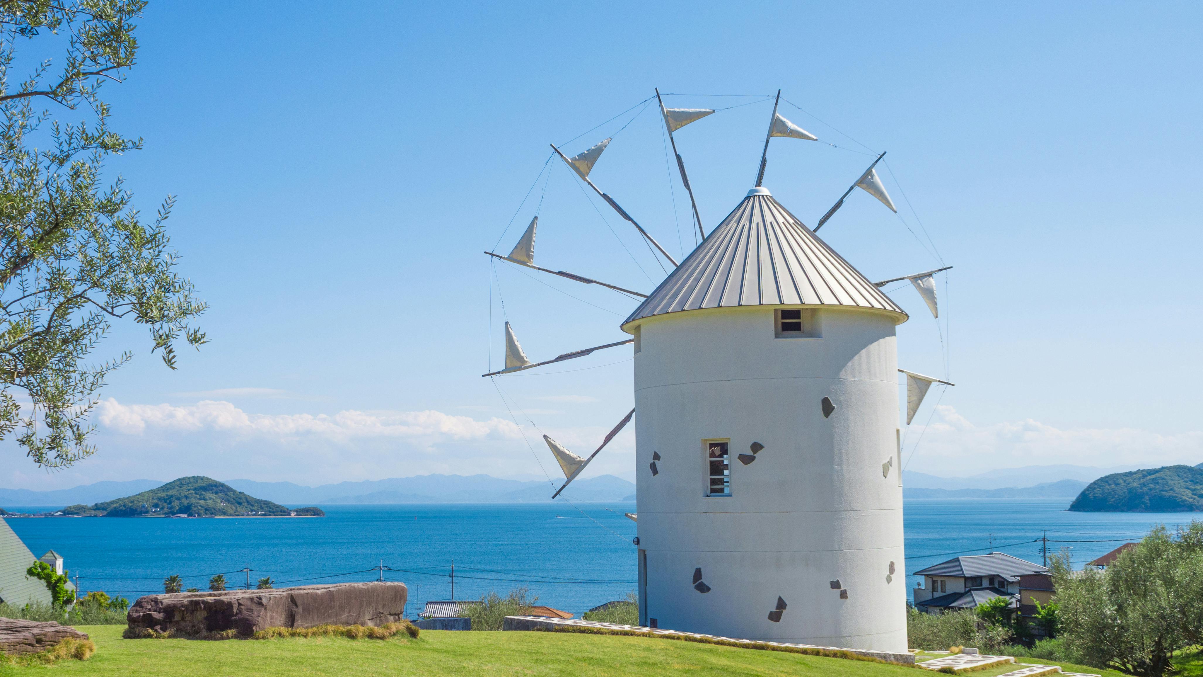 公園は瀬戸内海を見渡せる小高い丘に広がり、約2,000本のオリーブとハーブが育つ、まるで地中海のような風景が楽しめます。ギリシャ・ミロス島との友好を象徴する白い風車や、映画『魔女の宅急便』のロケセットなど、フォトスポットも豊富で、多くの観光客が訪れる人気の場所です。