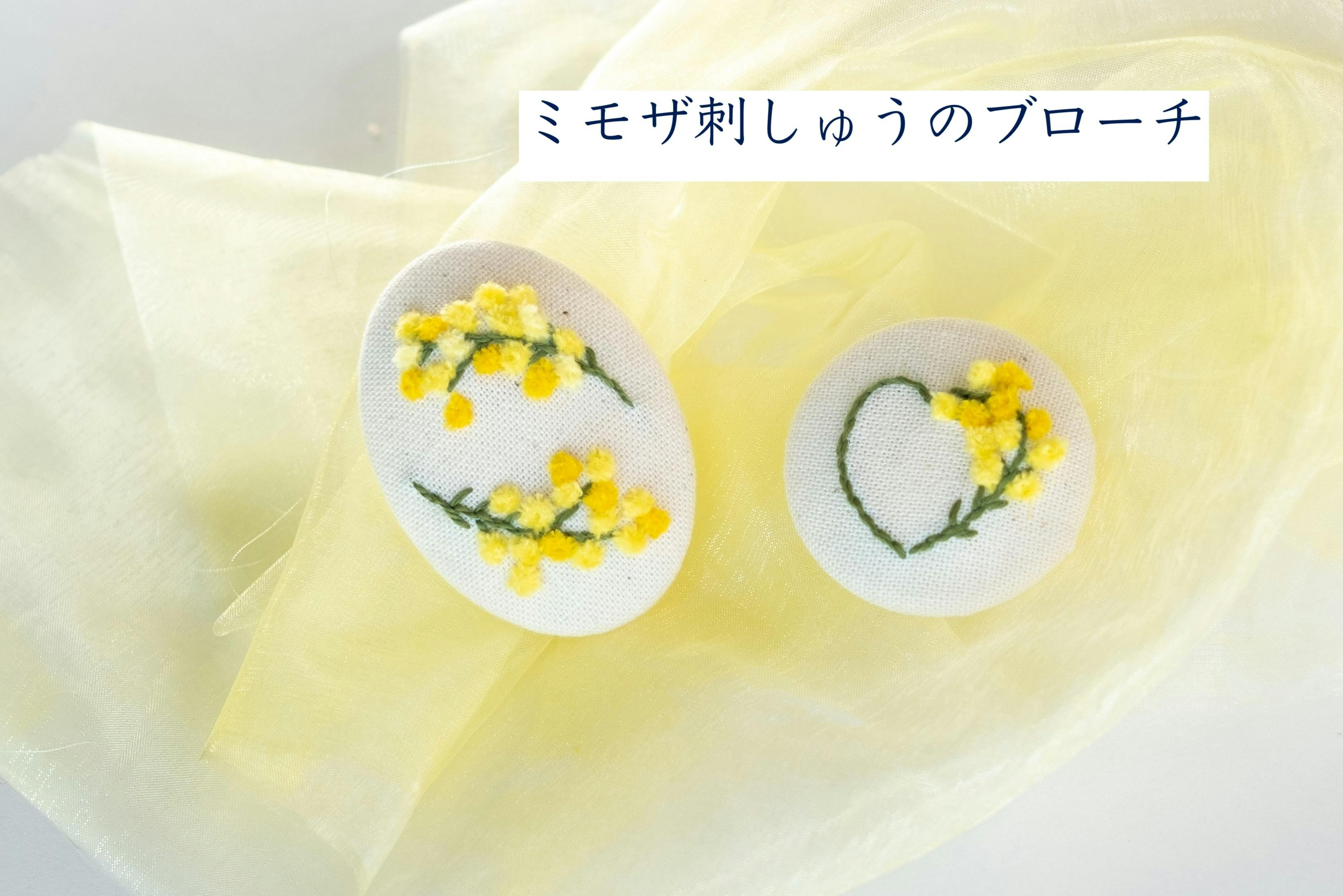 お一つ作っていませんか。円形やスクエアの刺しゅう額で制作するキット、小豆島ワークショップで開催したミモザブローチのキットなど、複数のミモザ制作キットをご用意しております。