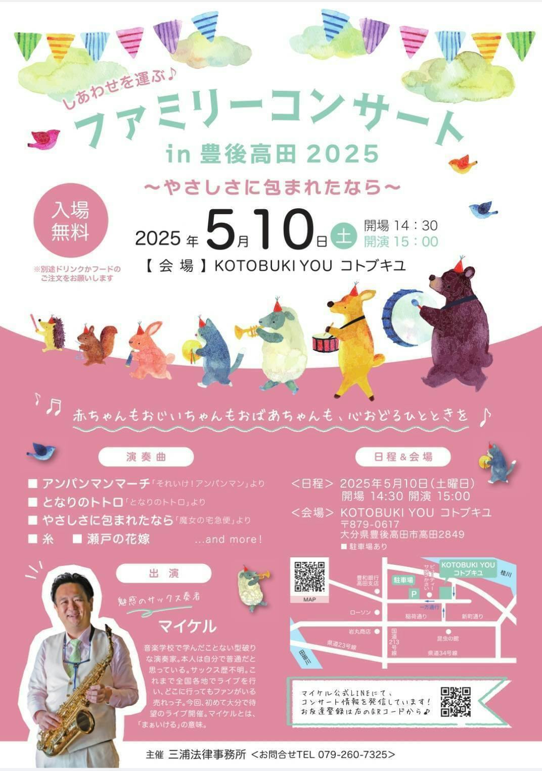 2025/10/29 14:18こんにちは。マイケルです。マイケルのコンサートは、単発ではなく、一連のファミリーコンサートという連続事業として行っています。11月 兵庫県しそう市12月 兵庫県姫路市(クリスマスコンサート)26年3月 兵庫県姫路市(ファミリーコンサート)26年5月 大分県豊後高田市(ファミリーコンサート)昨日は、豊後高田のファミリーコンサートの実行委員長花畑孝彦さん(プルデンシャル生命保険勤務)が姫路に来てくれて、5月に行うファミリーコンサートの曲を一緒に練習しました。5月のファミリーコンサートは、サックスだけではなく、歌やトロンボーンも来ますよ。お楽しみに。 もっと見る