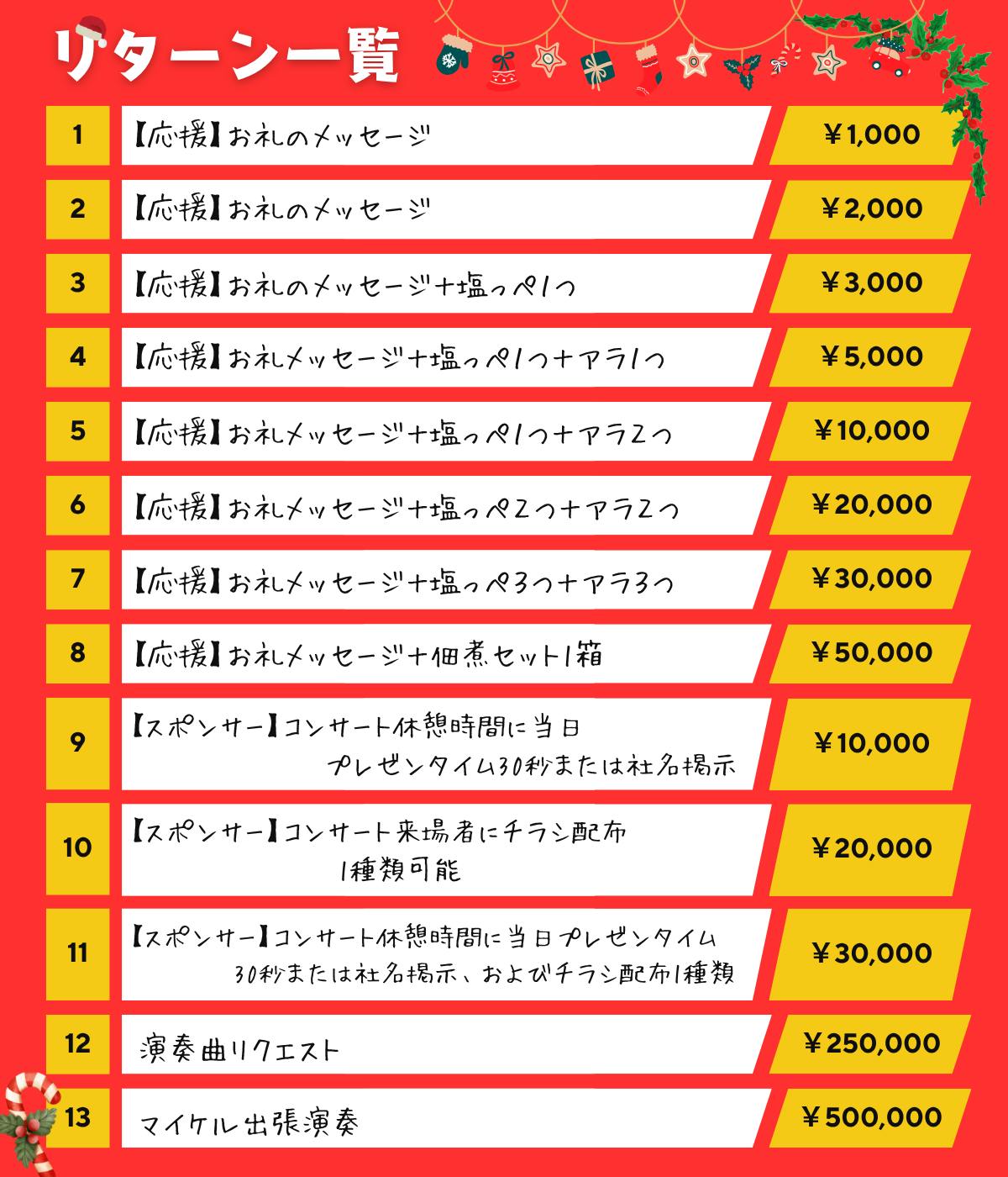 ③クラウドファンディング限定企画♪リクエスト曲にも対応:クラウドファンディング限定企画として、クリスマスコンサート内でリクエスト曲を演奏できるリターンもご用意!あなたのお気に入りの一曲をマイケルが生演奏しちゃいます!