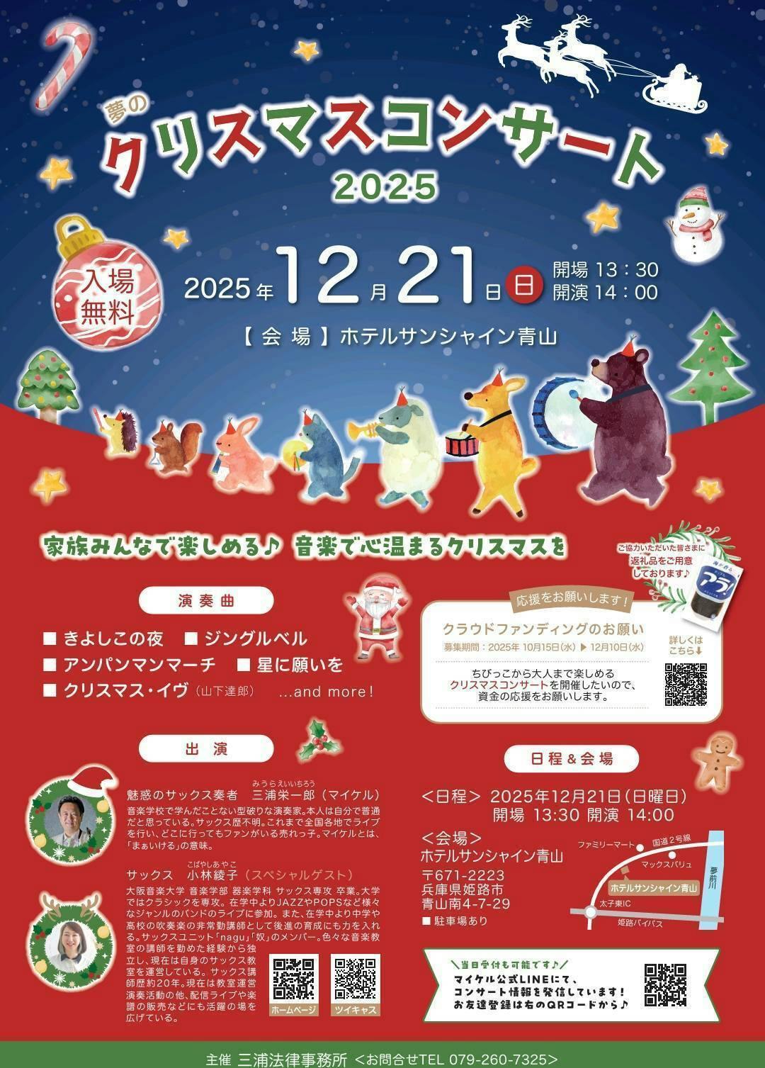 ①ユニークなクリスマスコンサート:弁護士でありながらサックス歴20年以上のキャリアを持つ、ユニークなサックス奏者マイケルのクリスマスコンサートを兵庫県でリアル開催!未就学児も気軽に参加でき、親子でサックスの美しい音色に触れることができます。