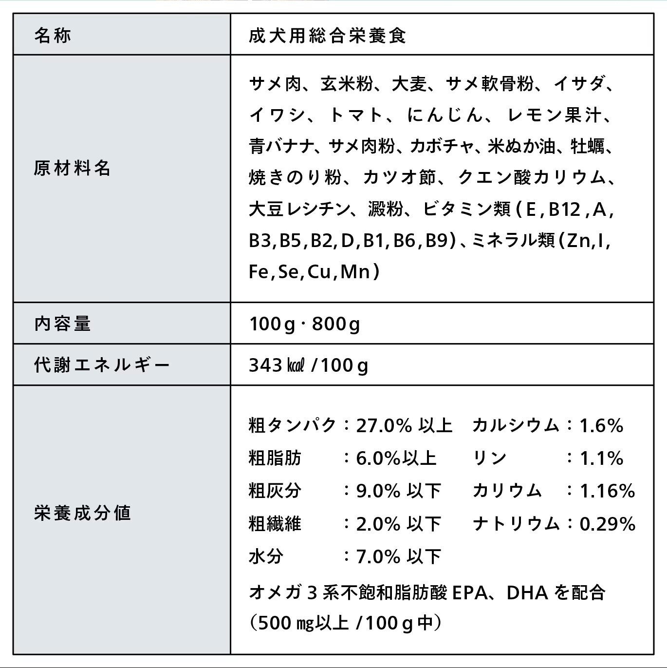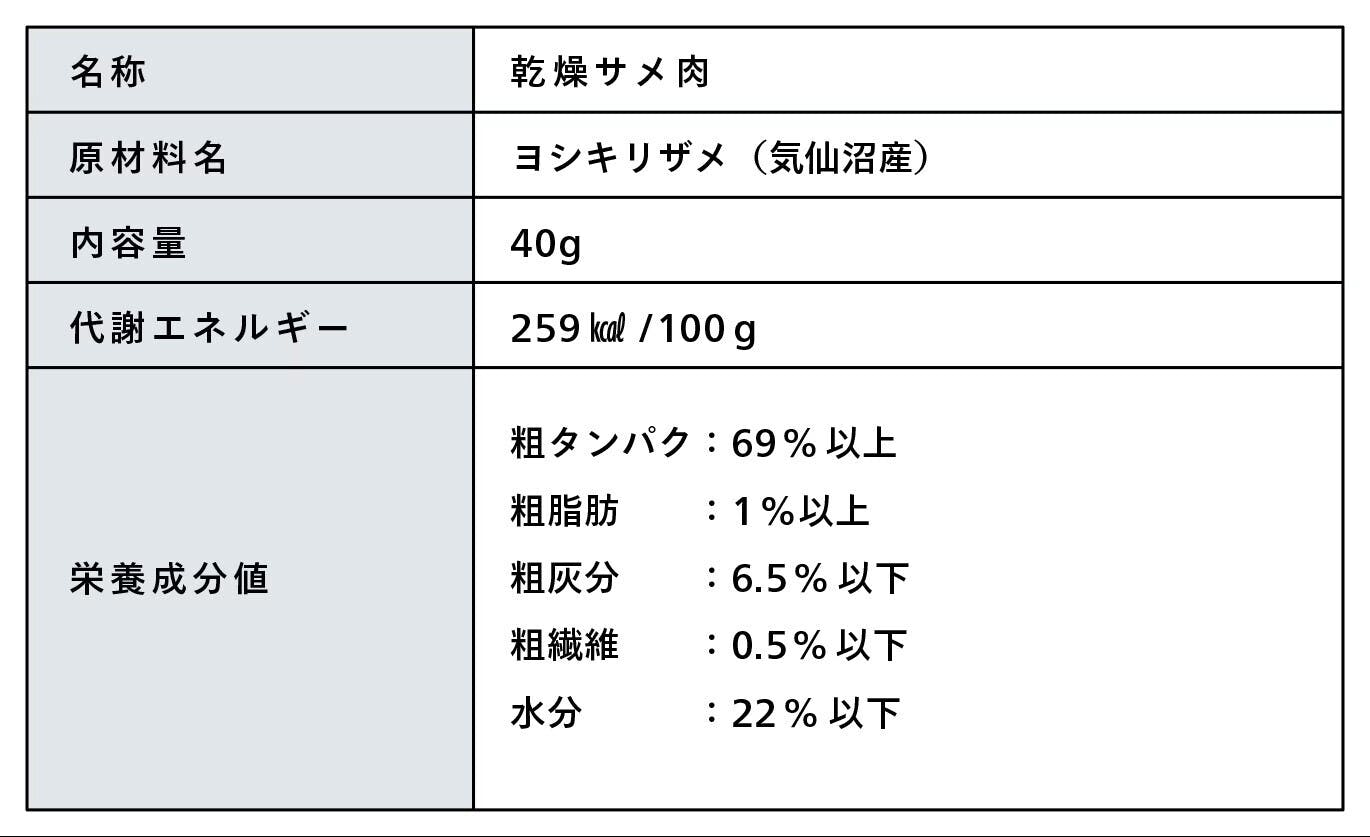 ▼ドッグフード「サメから生まれた総合栄養食(成分表)