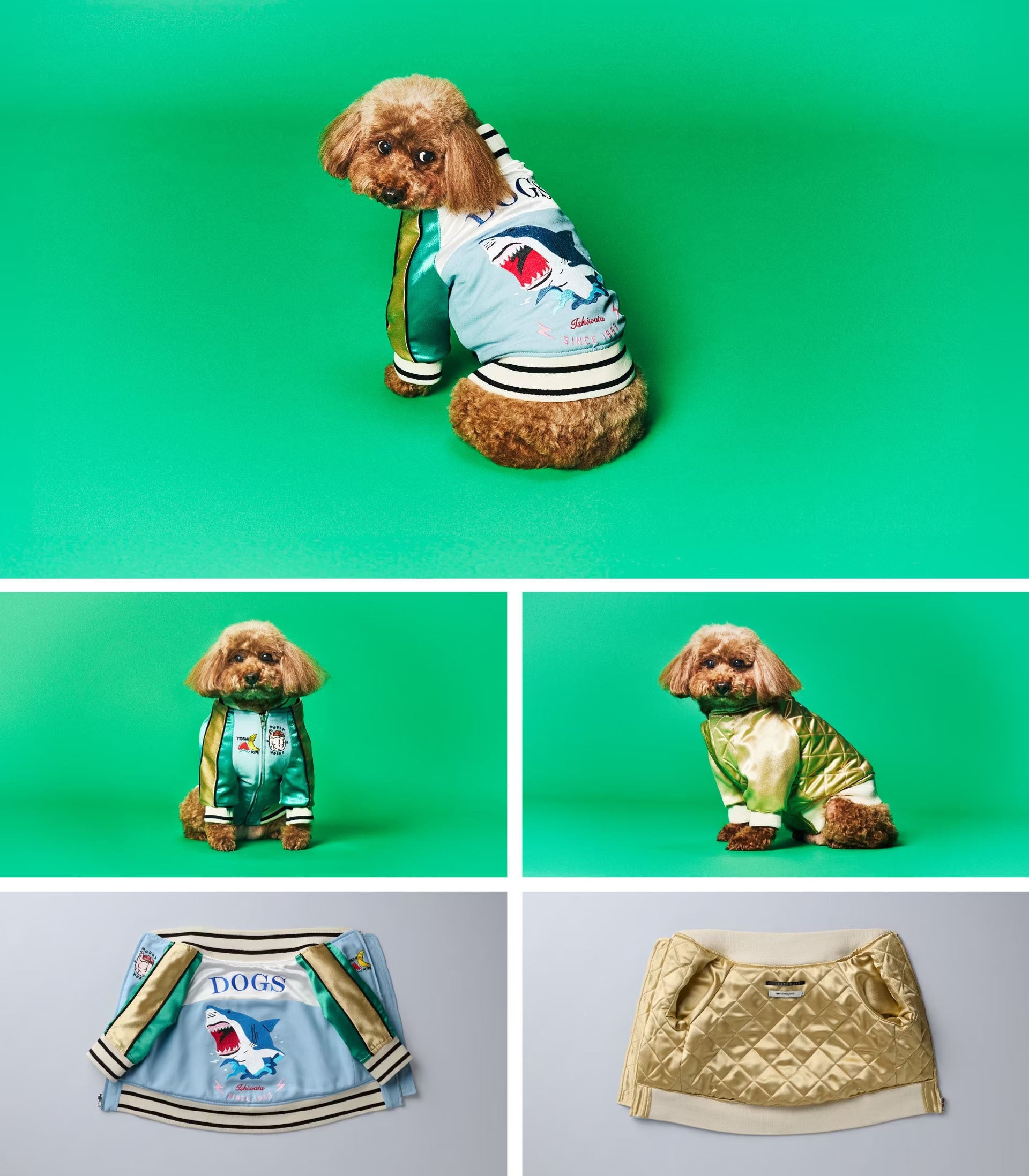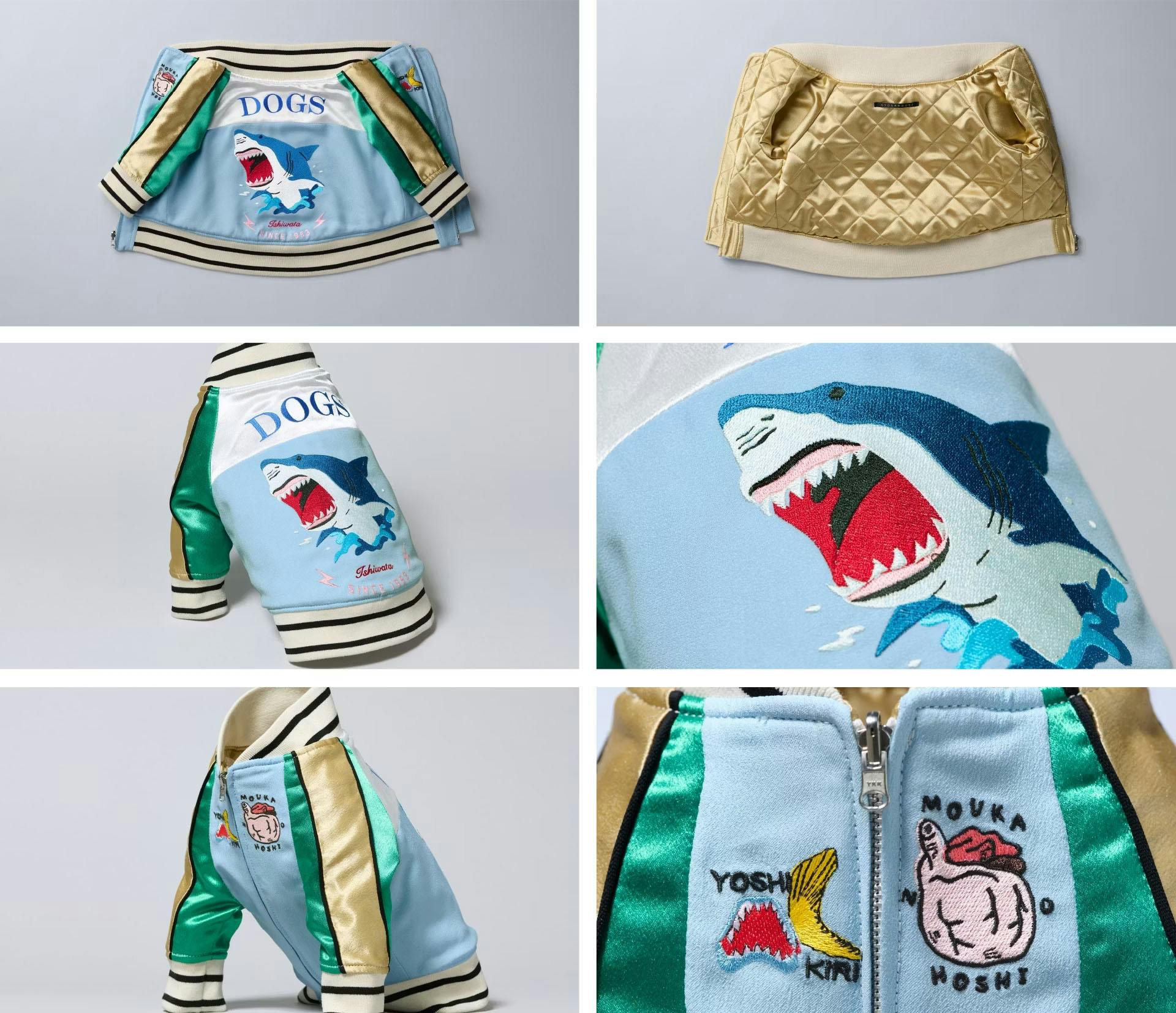サメジャン・ヌマジャンいずれも裏地はシルク100%を使用しています。デザインにもワンちゃんの着心地にもこだわった一着をぜひ、この機会に!