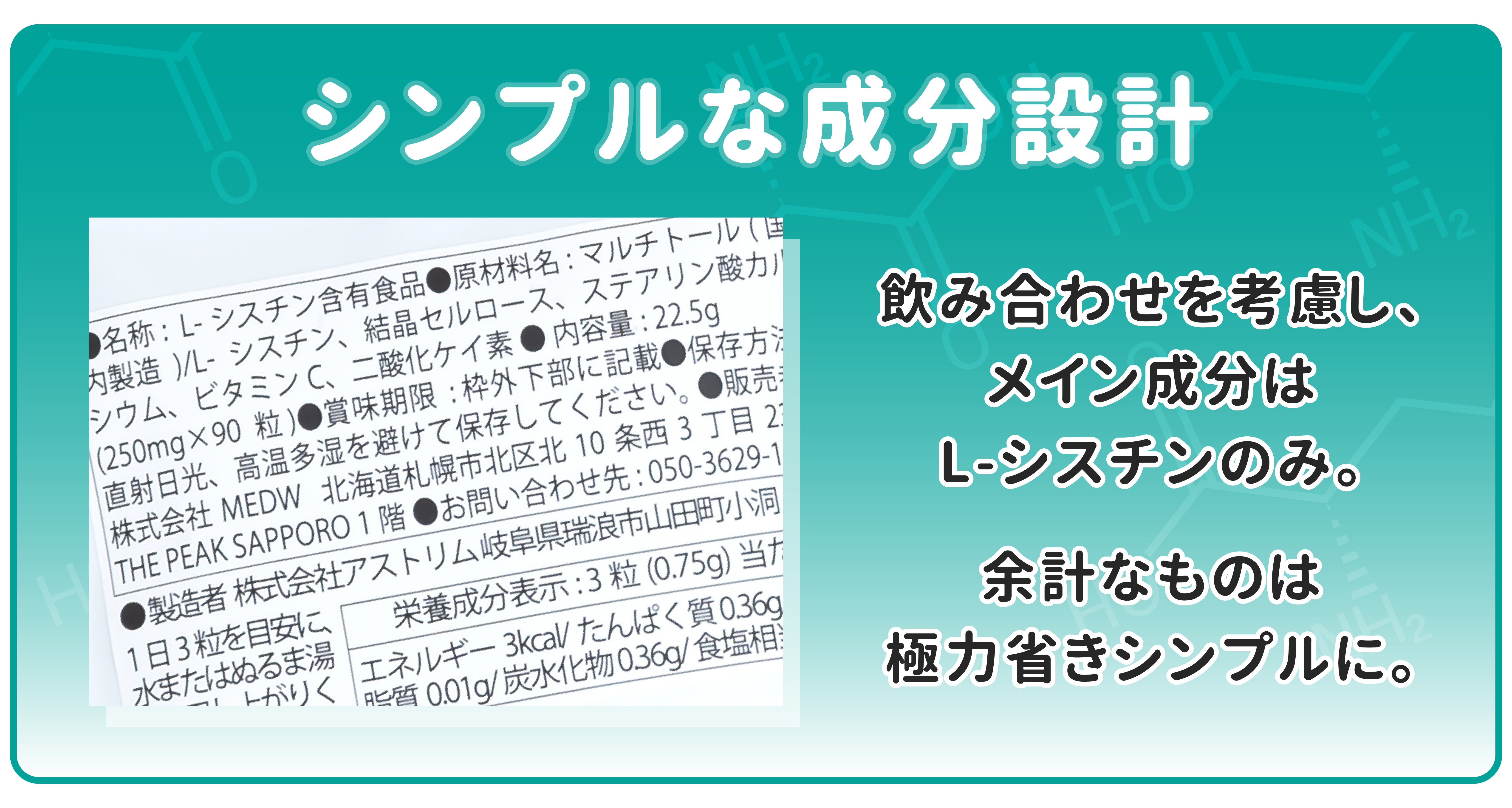 そしてブランド立ち上げと同時に、大学時代の先輩に協力していただき、あおぞら薬局鵠沼桜が丘店(株式会社クロスオーバー〈https://aozorapharmacy.jp/〉)と3年かけて共同開発したサプリが「L-シスチン500」です。
