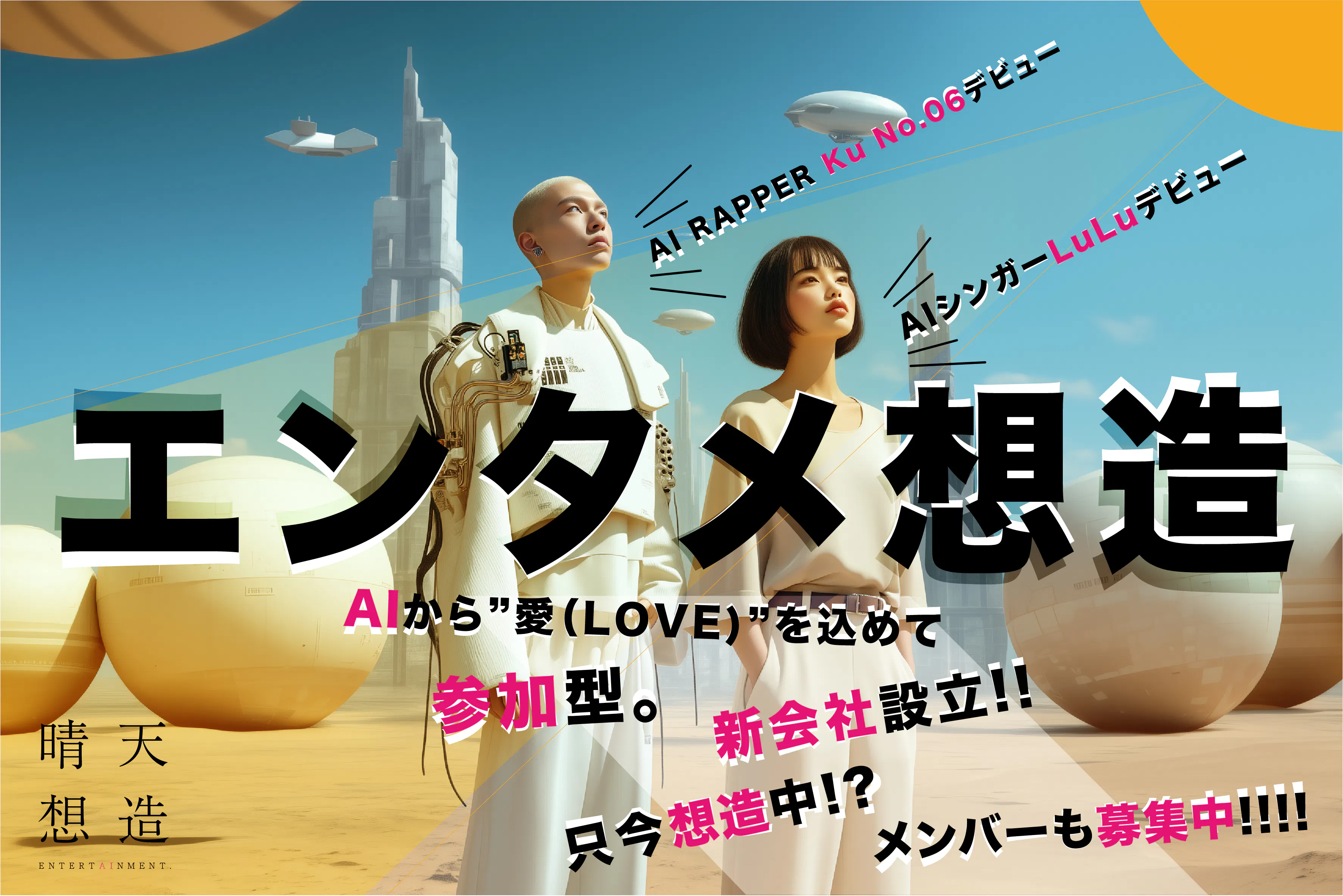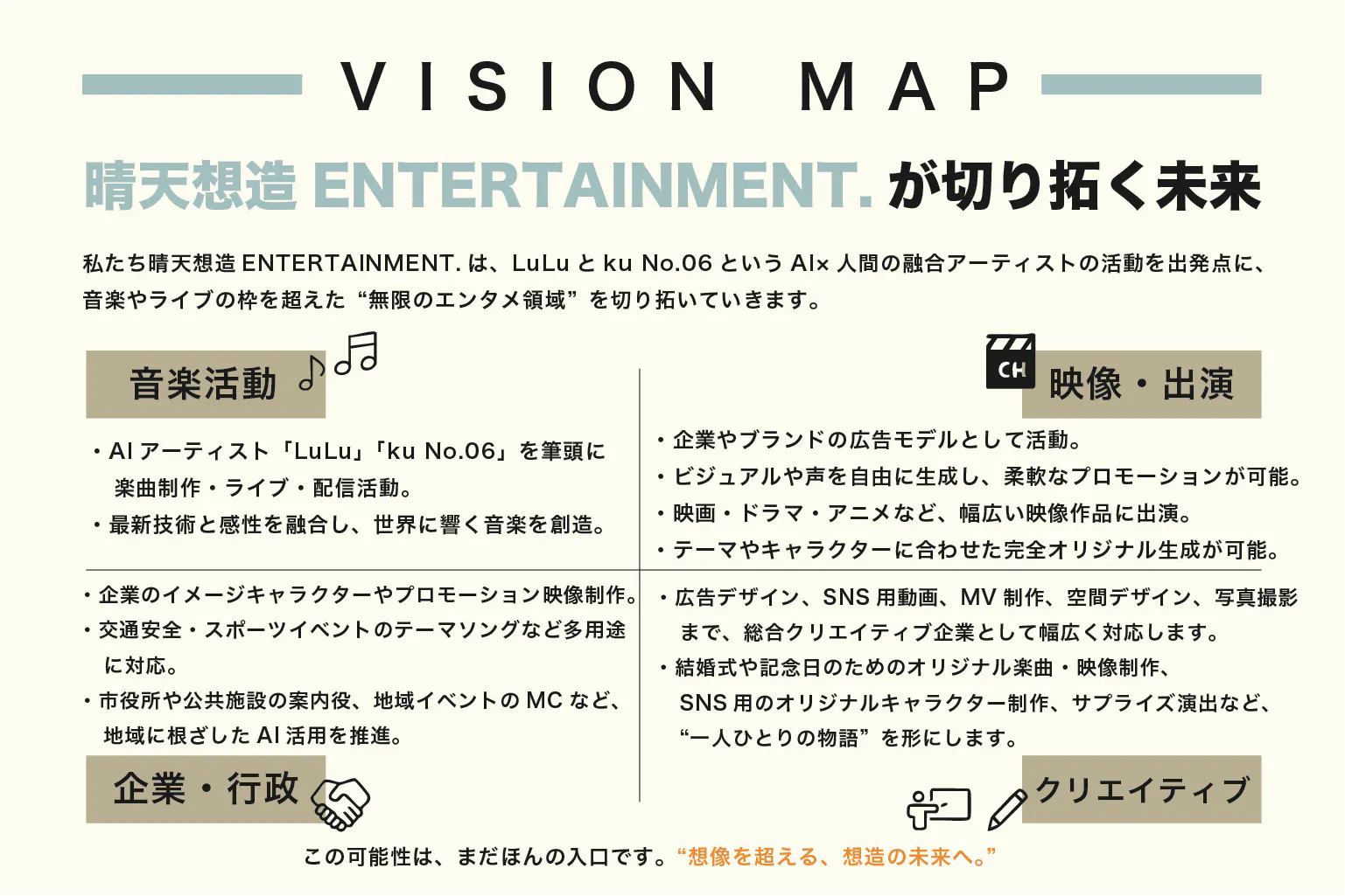私たち晴天想造ENTERTAINMENT.は、LuLuとku No.06というAI×人間の融合アーティストの活動を出発点に、音楽やライブの枠を超えた“無限のエンタメ領域”を切り拓いていきます。