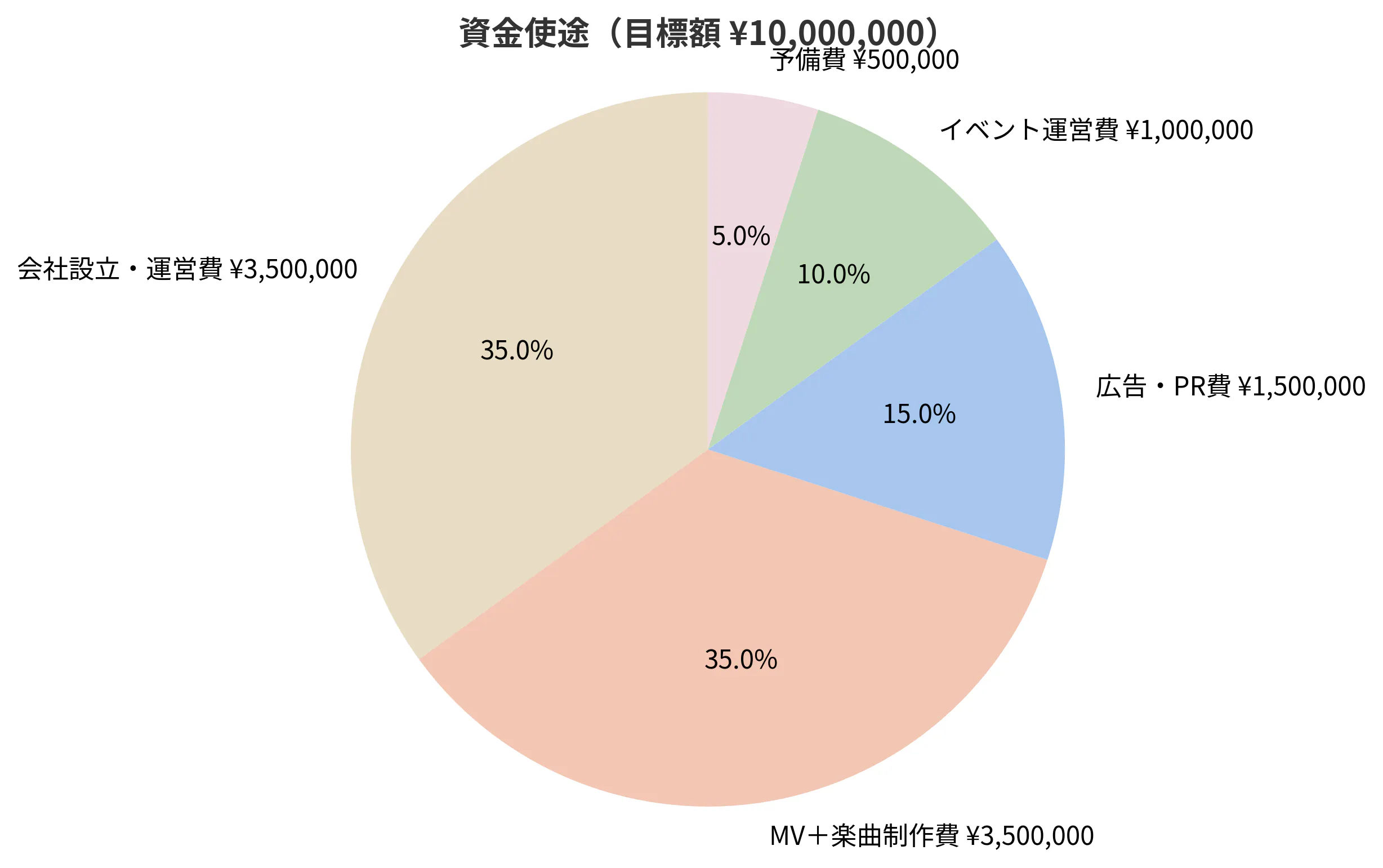 1. 会社設立・運営費 ¥3,500,000(35%)新会社「株式会社晴天想造ENTERTAINMENT.」の登記費用、オフィス準備費、運営に必要な各種システム・機材の導入、スタッフ稼働費を含みます。