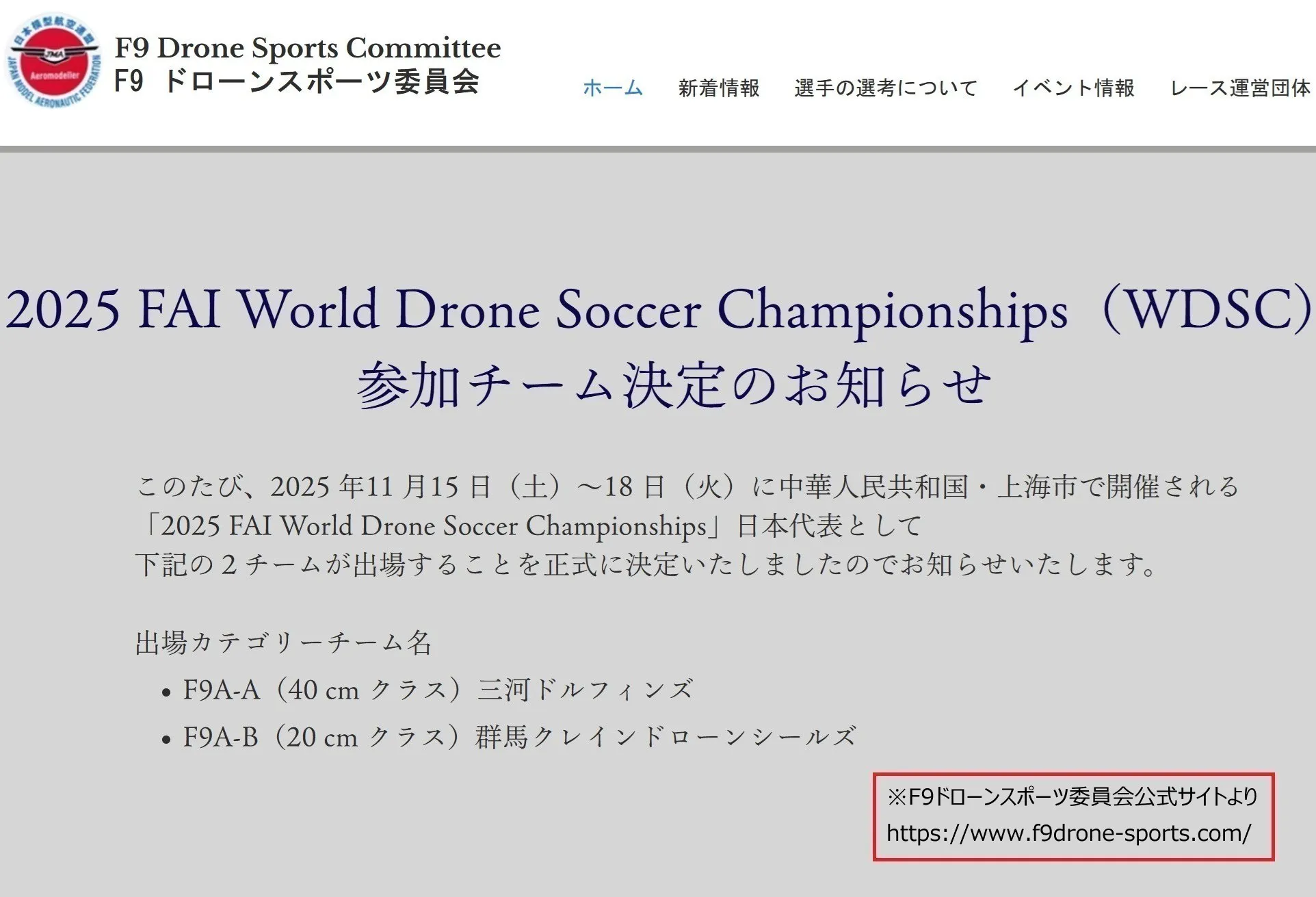 (情報掲載先/F9ドローンスポーツ委員会公式サイト https://www.f9drone-sports.com/ )