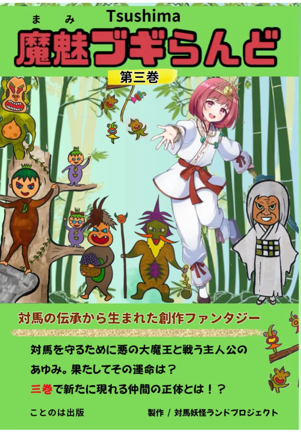 私たち、対馬妖怪ランドプロジェクトは、長崎県の北西部に浮かぶ国境の島「対馬」で、対馬の妖怪伝説である魔魅(まみ)の話を本にまとめたり、創作ファンタジー小説を制作して出版するなど、その魅力を全国に伝えることを目指して活動しています。