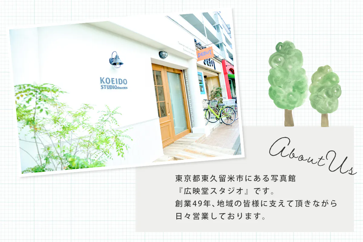 私たちは、東京都東久留米市で約50年にわたり、地域の皆さまの思い出を写真という形で残してきました。創業当時に赤ちゃんだった方が、今ではお子さまを連れて撮影に来てくださる──そんな世代を超えた繋がりが、地域とともに歩んできた証だと感じています。
