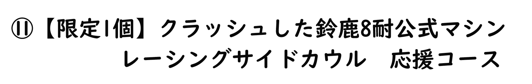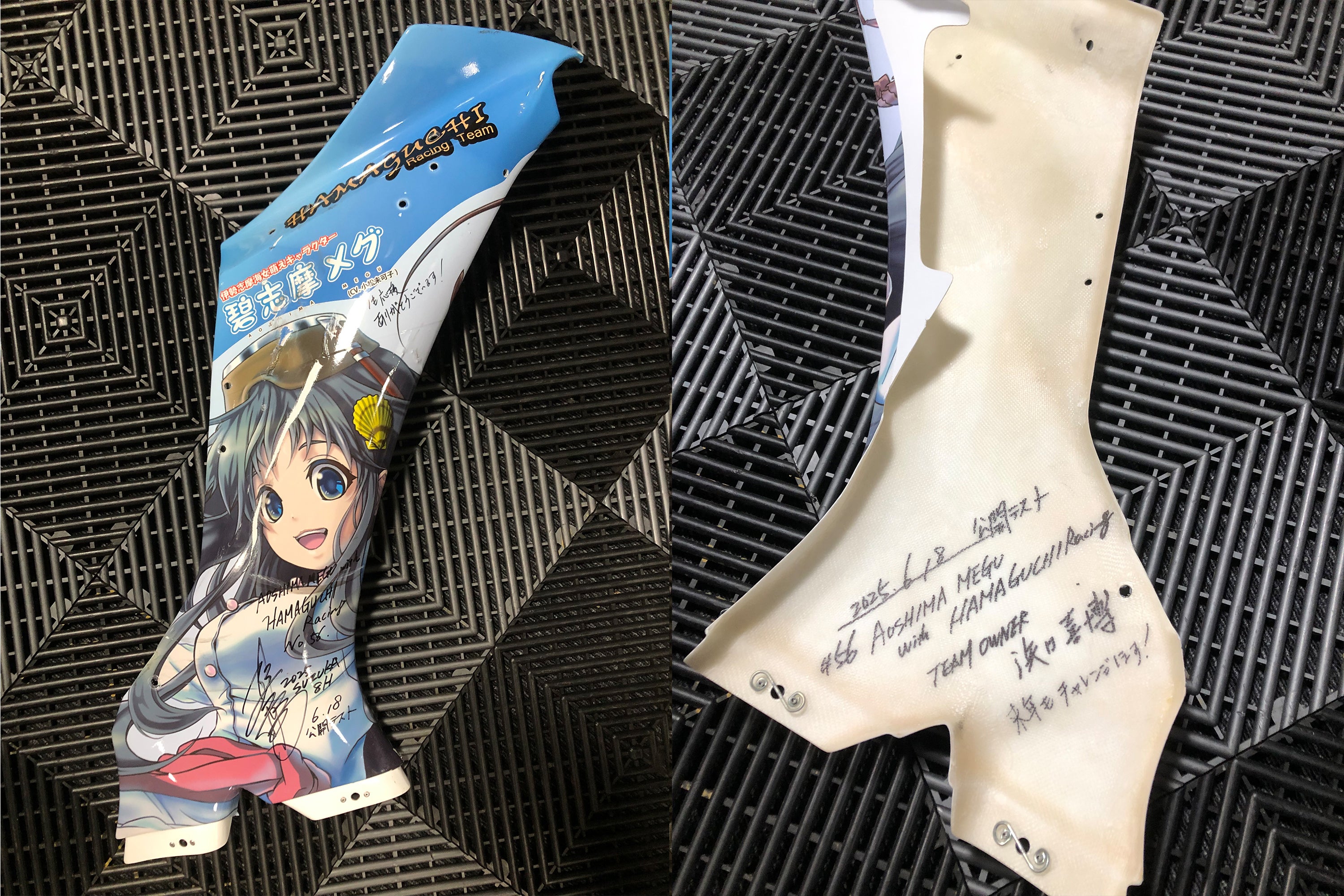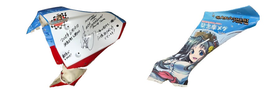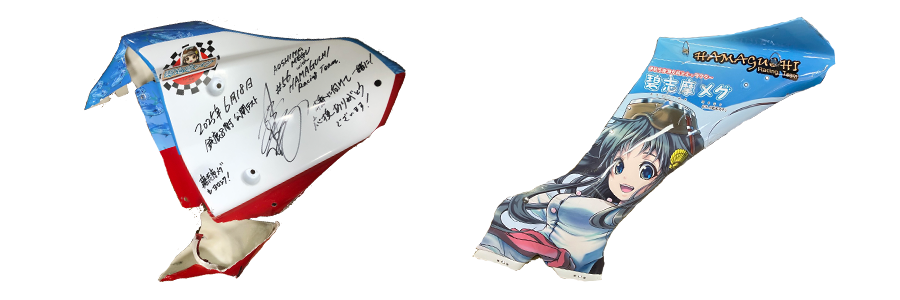 シケインでのクラッシュで使用されていた『鈴鹿8耐レーシングマシン』碧志摩メグ痛バイクの記念すべき、1号車(プロトタイプデザイン)⑩シートカウル(在庫終了)と⑪サイドカウルに直筆サインメッセージ入りを応援グッズとしてご用意させていただきます。世界に1個しかない貴重なものになります。