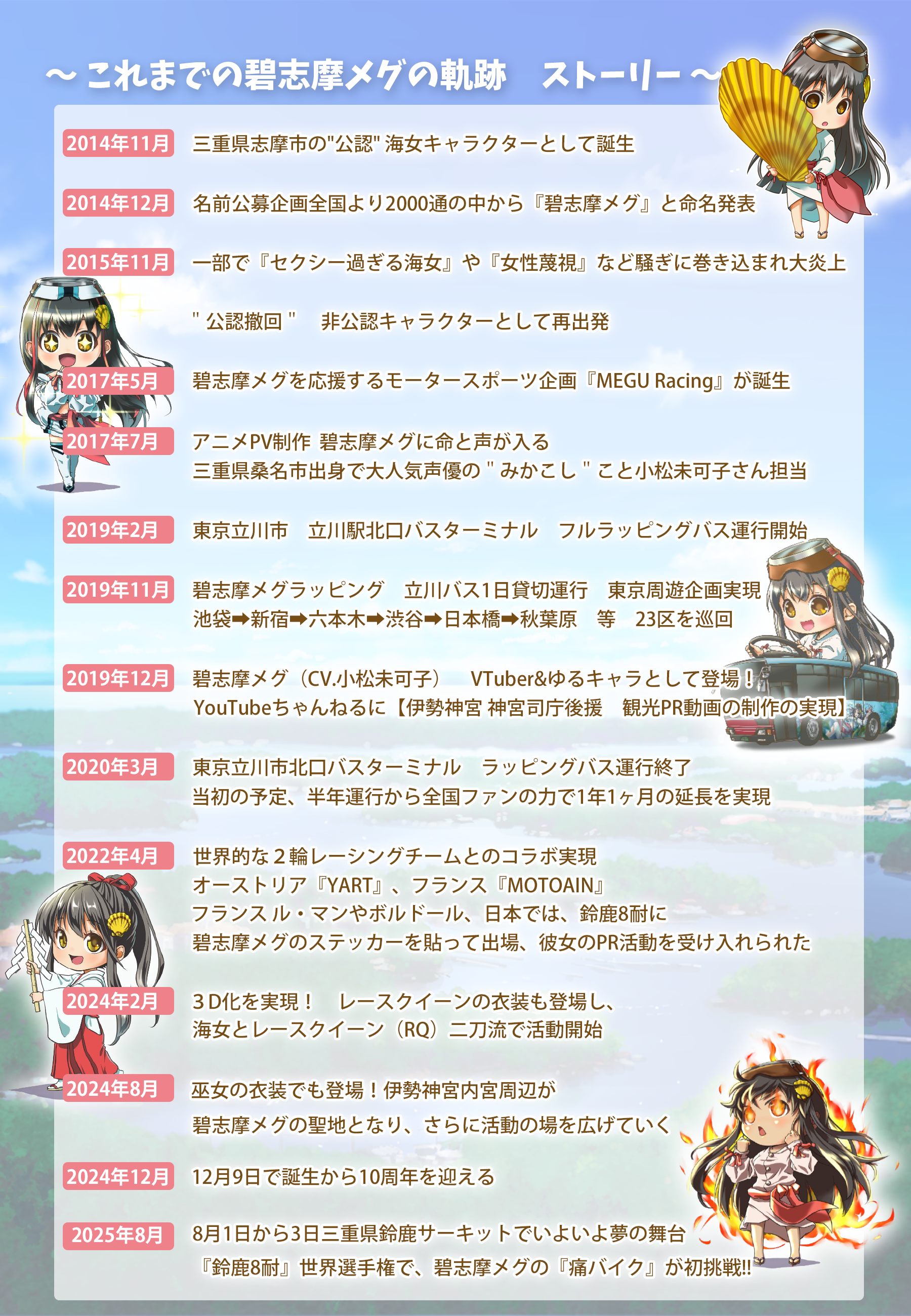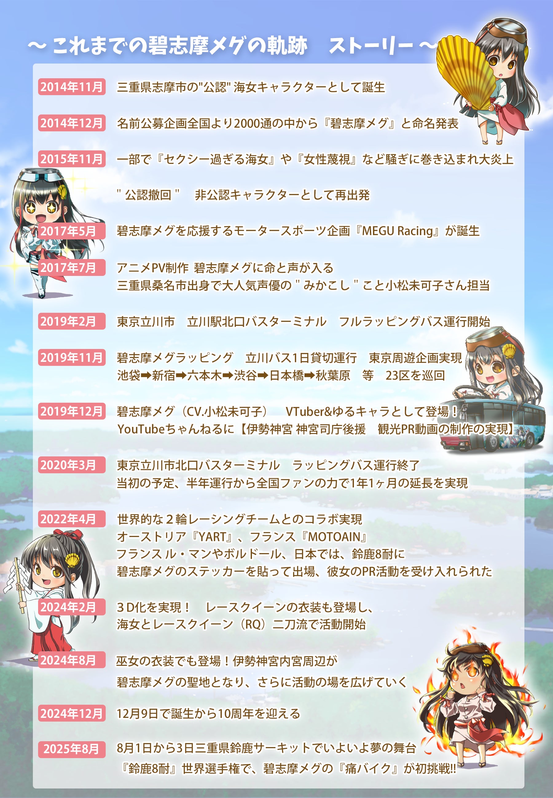 伊勢志摩海女萌えキャラクター碧志摩メグ(cv.小松未可子)は、2014年12月に誕生し、様々な困難に局面するものファンの皆様のおかげで2024年12月、10周年を迎えることができました!