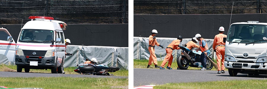 6月18日の公開練習にて開始早々、他車との接触事故に巻き込まれ、マシンフロント周りが大破。第1ライダーの横山尚太選手も脳震盪を起こして救急車で運ばれるといった大変な事になってしまいました。