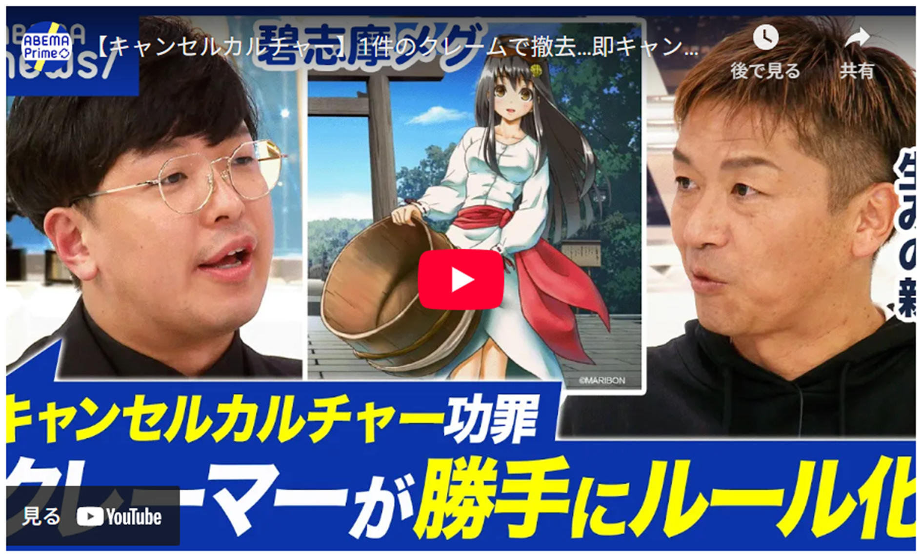 2025/10/27 20:09碧志摩メグを応援いただいている皆様へ-------------------------------------------------------------------------------★【キャンセルカルチャー】1件のクレームで撤去…即キャンセルはやりすぎ?表現が委縮する可能性は?|アベプラ Youtbe 編集版https://youtu.be/6RAMtcqchns?si=RGnH_mNzSuvn_Otp-------------------------------------------------------------------------------先日、10月23日のアベプラ スタジオ生放送に、碧志摩メグ生みの親で代表の浜口喜博がゲスト出演。碧志摩メグ立ち上げ当初の思いや今の活動を公共の場で発言して参りました。確かに大変なことが沢山経験しましたが、こういった活動が継続できることも全国から支えていただいているファンの皆様のおかげです。いつもありがとうございます。-------------------------------------------------------------------------------★萌えキャラで何故NG?キャンセルされた人と考える!炎上した後の対処法は?#アベプラ【平日よる9時~生放送】 | 企画 27分2025年10月23日放送https://abema.tv/video/episode/89-66_s99_p6781-------------------------------------------------------------------------------私たちスタッフ、そして、浜口共、皆様のご期待にこたえられるようにこれからも頑張っていきますので、引き続き、応援の程、宜しくお願い致します。※また現在徐々にリターン返礼品の方もお送りしていますが、遅れを生じてしまっているものもありますので恐れ入りますが今しばらくお待ちください。碧志摩メグ運営スタッフ一同 もっと見る