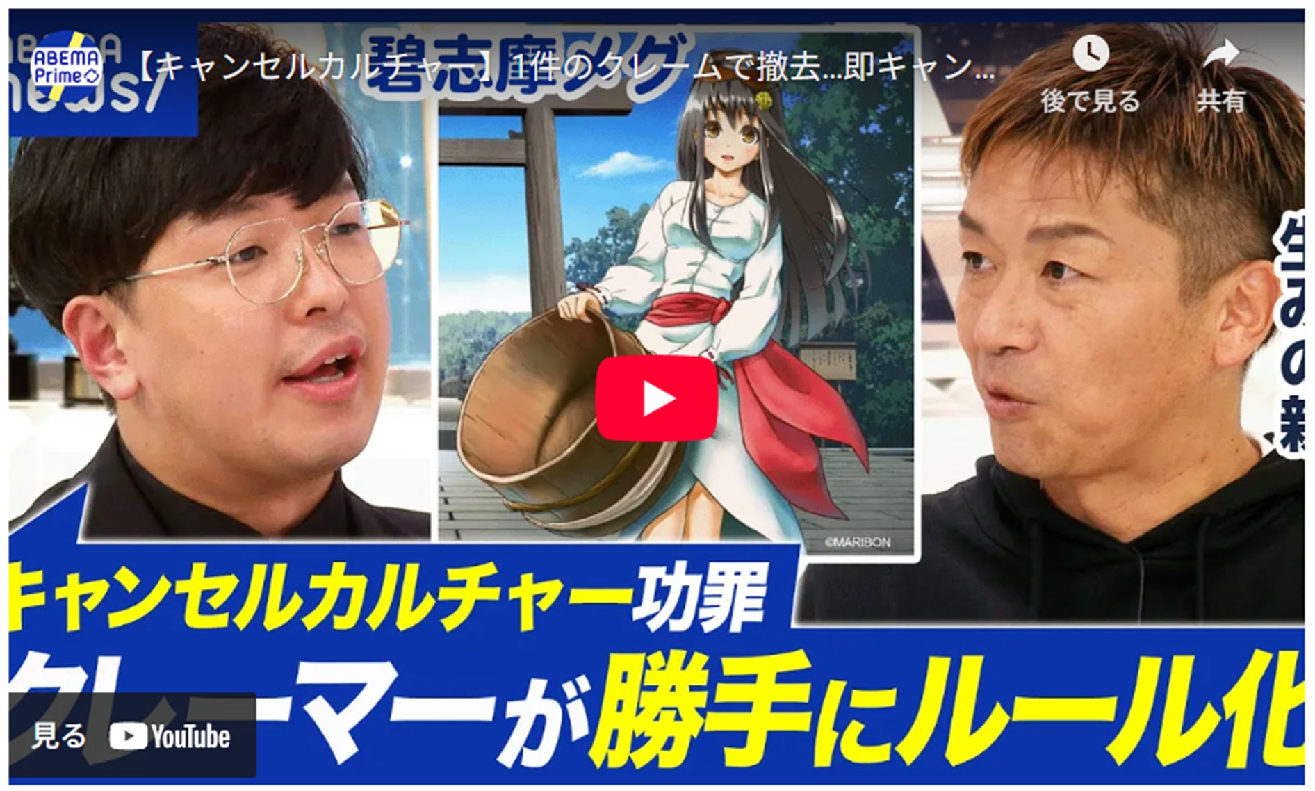 碧志摩メグを応援いただいている皆様へ-------------------------------------------------------------------------------★【キャンセルカルチャー】1件のクレームで撤去…即キャンセルはやりすぎ?表現が委縮する可能性は?|アベプラ Youtbe 編集版https://youtu.be/6RAMtcqchns?si=RGnH_mNzSuvn_Otp-------------------------------------------------------------------------------先日、10月23日のアベプラ スタジオ生放送に、碧志摩メグ生みの親で代表の浜口喜博がゲスト出演。碧志摩メグ立ち上げ当初の思いや今の活動を公共の場で発言して参りました。確かに大変なことが沢山経験しましたが、こういった活動が継続できることも全国から支えていただいているファンの皆様のおかげです。いつもありがとうございます。-------------------------------------------------------------------------------★萌えキャラで何故NG?キャンセルされた人と考える!炎上した後の対処法は?#アベプラ【平日よる9時~生放送】 | 企画 27分2025年10月23日放送https://abema.tv/video/episode/89-66_s99_p6781-------------------------------------------------------------------------------私たちスタッフ、そして、浜口共、皆様のご期待にこたえられるようにこれからも頑張っていきますので、引き続き、応援の程、宜しくお願い致します。※また現在徐々にリターン返礼品の方もお送りしていますが、遅れを生じてしまっているものもありますので恐れ入りますが今しばらくお待ちください。碧志摩メグ運営スタッフ一同